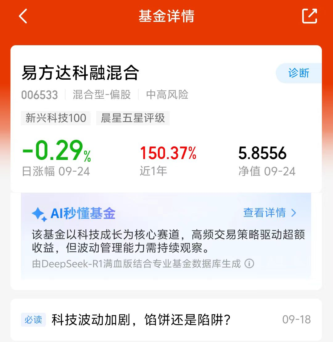 大盘近期表现不错,今天继续上涨,最近板块轮动速度很快,$易方达科融混合(OTCFUND|006533)$持仓有科技、新能源和军工等板块,轮动配置,可以避险单一科技赛道回调带来的风险,近一月涨了22.77%,近三个月涨了84.55%,近一年涨了150.37%,业绩很不错,能涨抗跌,看好这个方向,我准备分批加仓了!