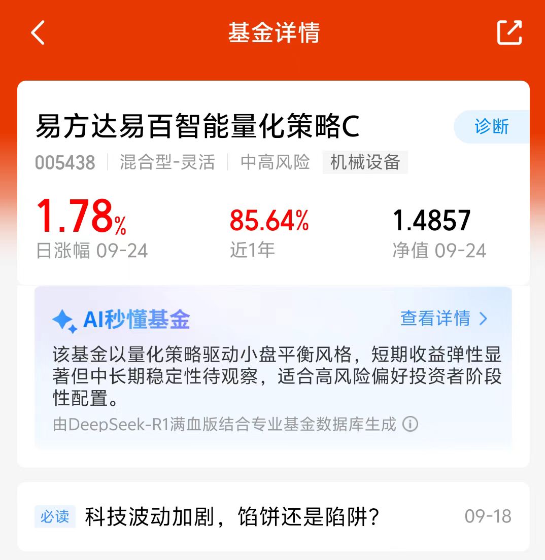 大盘近期表现不错,今天继续上涨,大科技、新能源等板块表现都很不错,近期各大板块轮动速度很快,我打算加仓量化基,$易方达易百智能量化策略C(OTCFUND|005438)$高频调仓,牛市各大板块开始轮动了不怕踏空,近一年涨了85.64%,长期业绩还不错,我准备分批加仓了!