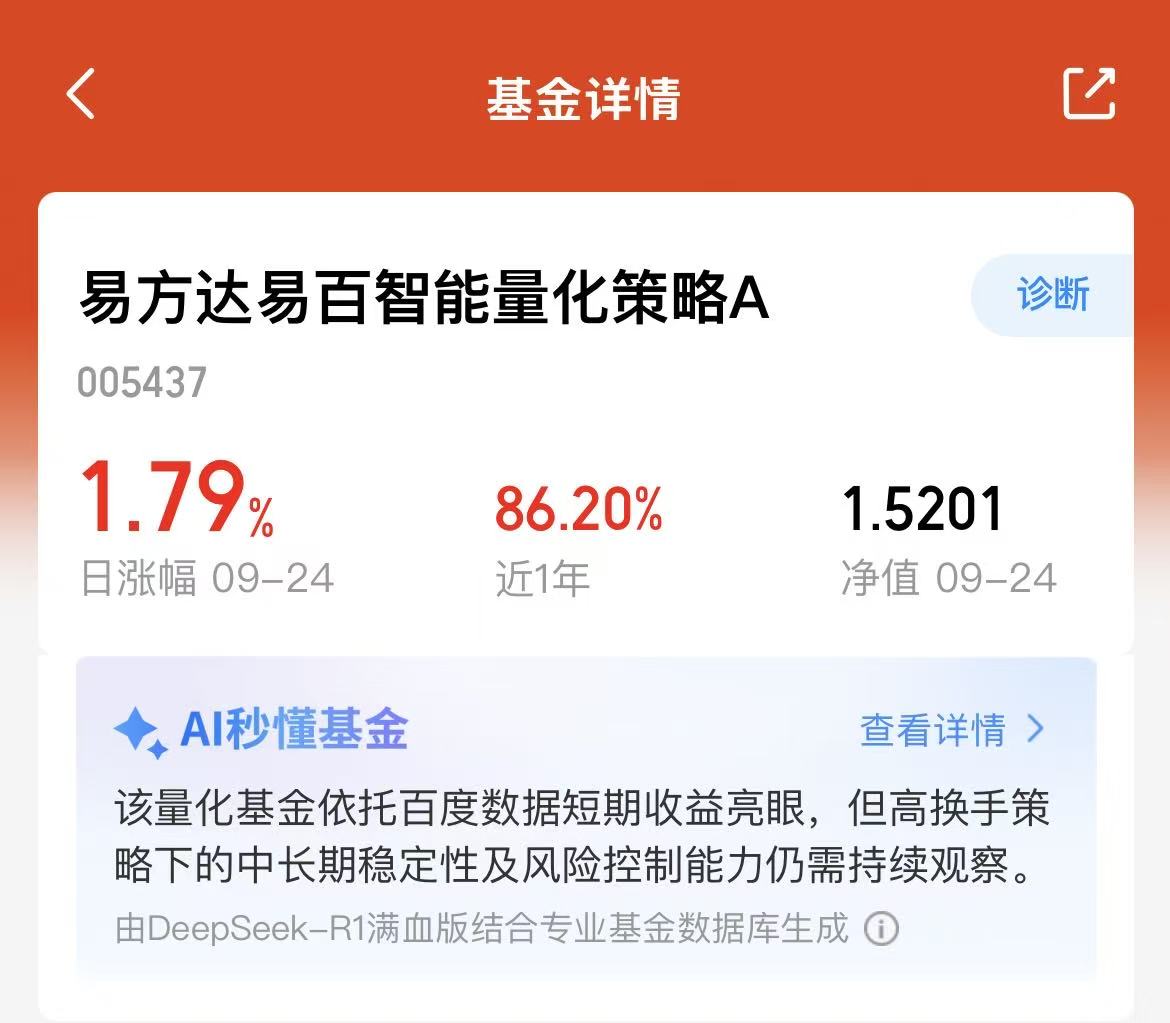 近期板块轮动的比较快,真是不好抓住赛道呢,前段时间医药给力,现在又到科技了,太难了,不过小盘方向量化基我觉得是比较稳的,长期跑赢大盘,而且牛市行情还在延续,量化基往往在牛市中都能大放光彩,$易方达易百智能量化策略A(OTCFUND|005437)$是覆盖能源、材料、半导体等多个领域的,年化收益率86.2%,还不错呢!