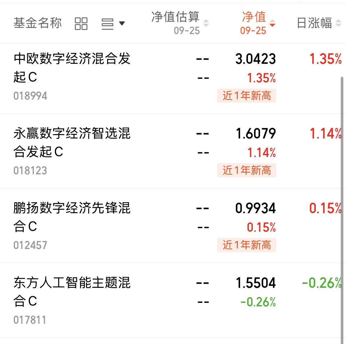 $永赢数字经济智选混合发起C(OTCFUND|018123)$涨1.14%,$鹏扬数字经济先锋混合C(OTCFUND|012457)$涨0.15%