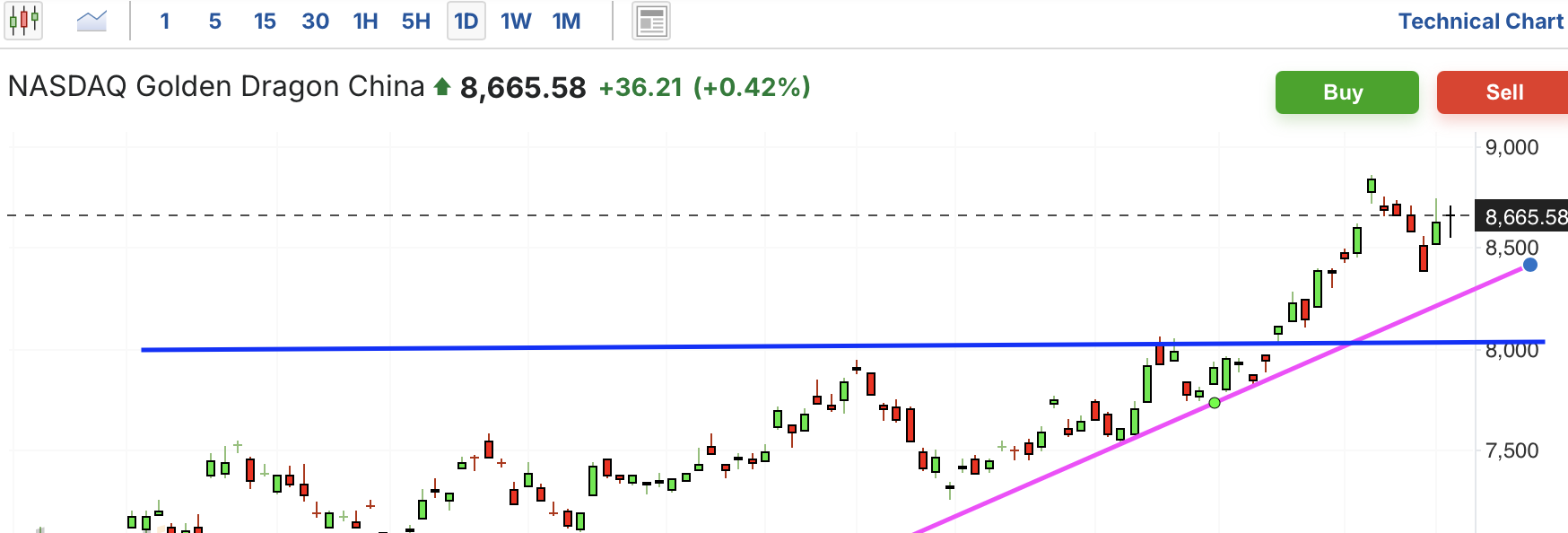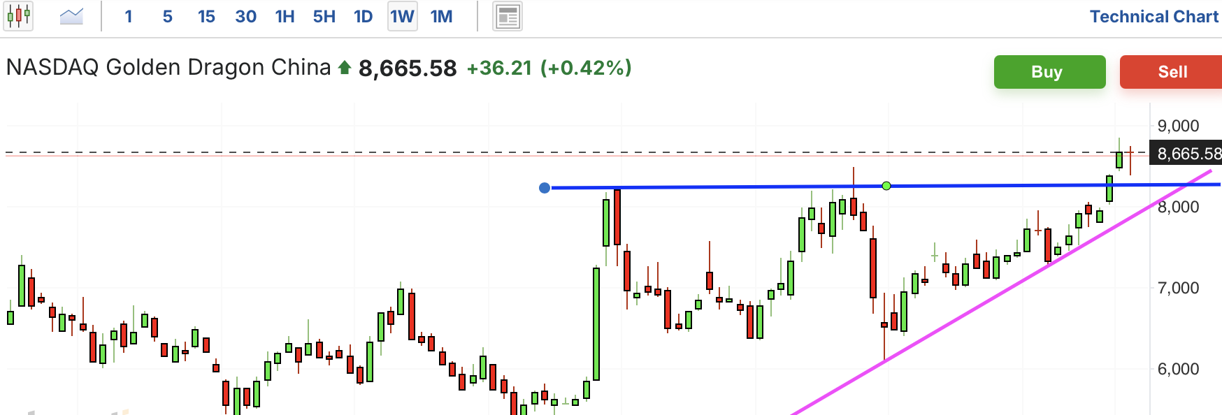 中概股此前长期盘整,近期拉升,突破关键压力位,趋势反转向上。最近在上行途中大幅回撤,好在很快反弹,没有跌破上行趋势线。
