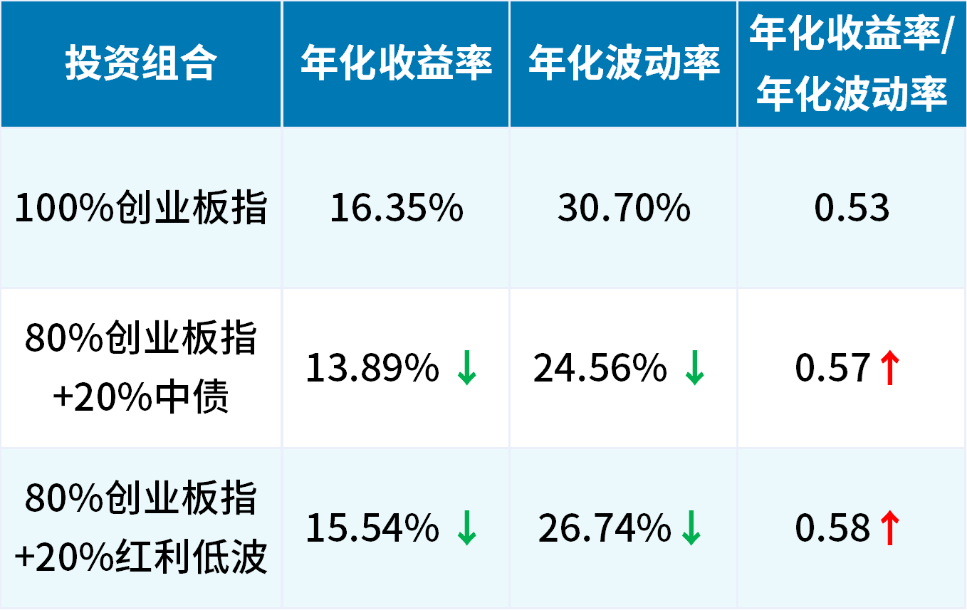 长期来看,在单一投资创业板指数的情况下,加入一定比例的低波动资产,年化收益率虽然略有下降,但是年化波动率却降低不少,尤其是投资性价比(年化收益率/年化波动率)均有上升。
