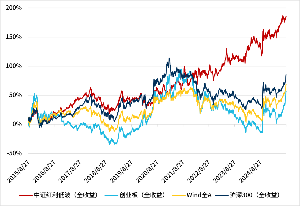 中证红利低波指数的年化波动率远低于创业板指数。但是,从近十年的业绩表现来看(见图2),中证红利低波指数的累计收益率为184%,却远超同期创业板指数55%的涨幅。