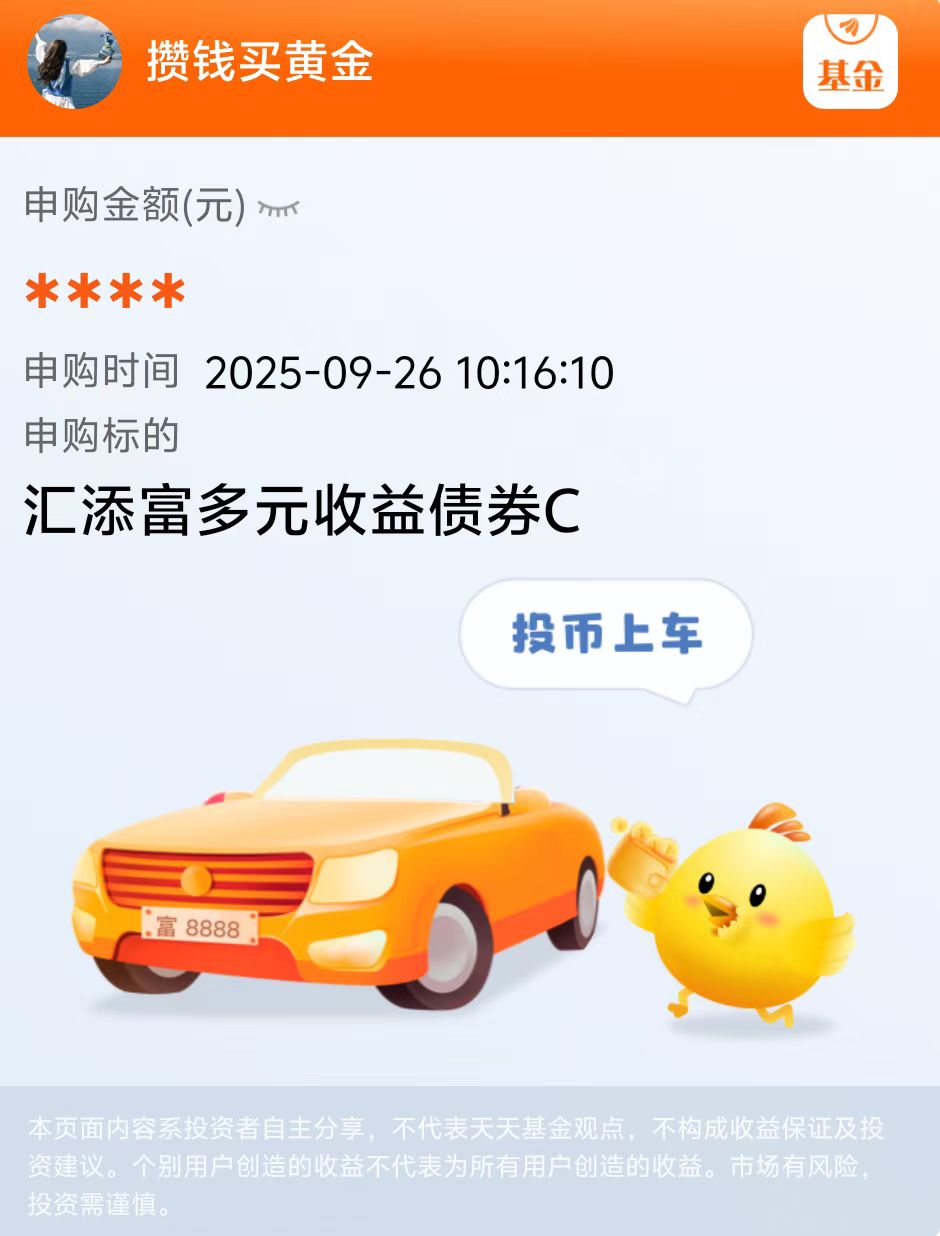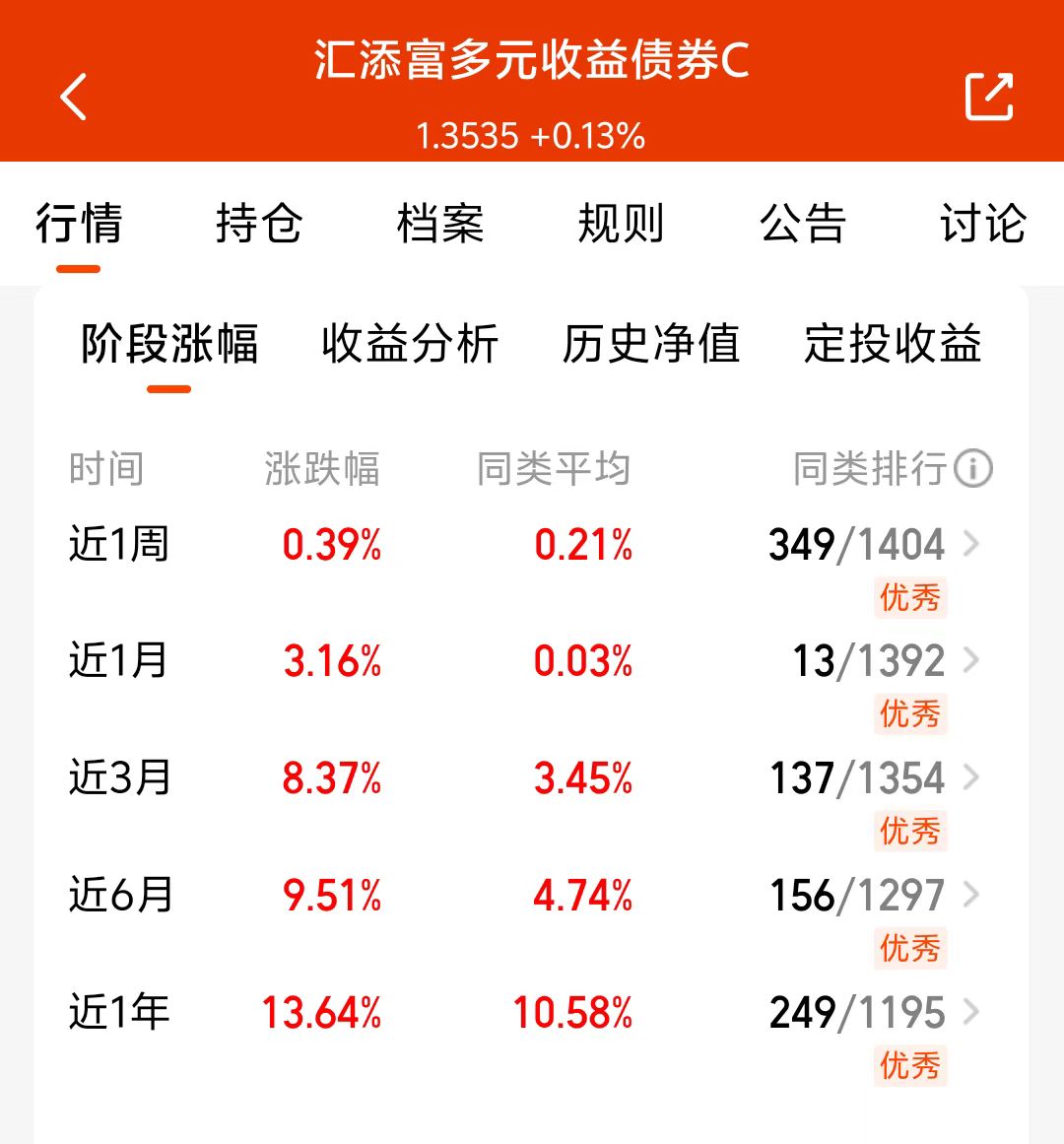 汇添富多元收益债券C近一周收了39个蛋,近一月收了316个蛋,近三个月收益率8.37%,近一年最大回撤仅1.59%,能涨抗跌,显著跑赢同类固收+产品,我打算把30%-50%的仓位放在固收+,看好这个方向,今天先加仓一笔,之后在分批加仓了!