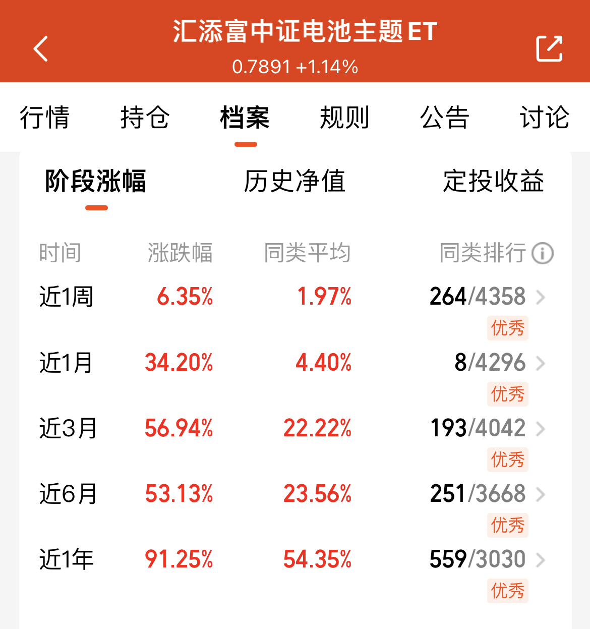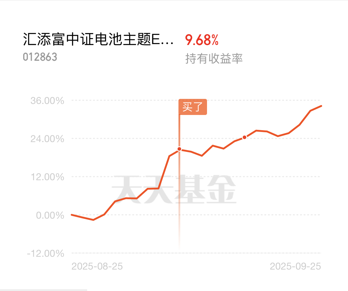选电池指数基金,我就选费率最低的$汇添富中证电池主题ETF发起式联接C(OTCFUND|012863)$,成本够实在,业绩也更能打。近一周涨6.35%、近一月飙34.20%、近三月冲56.94%,连近一年都涨超91%,每阶段涨幅都大幅跑赢同类平均,超额收益明显。而且它精准跟踪中证电池指数,90%以上资产扎进电池产业链,从上游材料到下游应用全覆盖,能把储能、固态电池的红利吃透。