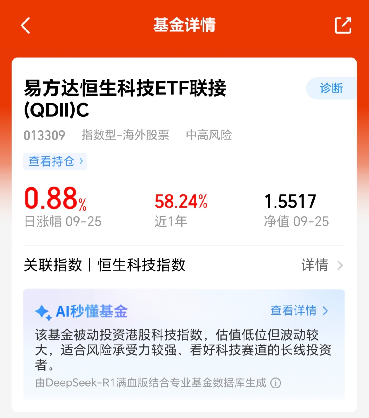 今日A股、港股市场都出现震荡回调,其中大科技板块波动明显,但马上十一假期来临,而从过去10年里来看,国庆期间港股上涨概率高,刚好这次回调给了我低吸的机会,$易方达恒生科技ETF联接(QDII)C(OTCFUND|013309)$近期迎来连续上涨趋势,近1月涨幅9.17%,近一年涨超58.24%,远超同类平均32.64%,虽然已经涨幅不少,但估值仍低,我也将保持长期看好态度了!