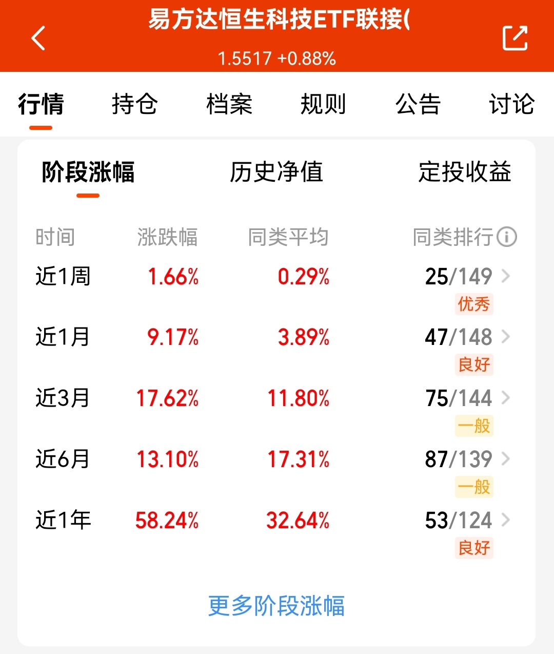 今日港股市场呈现震荡趋势,恒生科技也出现回调,不过当前恒生科技,相对A股科技仍然滞涨,所以无需恐高,我会选择逢低加仓策略,继续定投$易方达恒生科技ETF联接(QDII)C(OTCFUND|013309)$持仓聚焦港股科技龙头,近一年涨幅高达58.24%,同时港股十一不休市,过去10年里来看,每当此时港股上涨概率就高,期待节后能有不错收获啦!