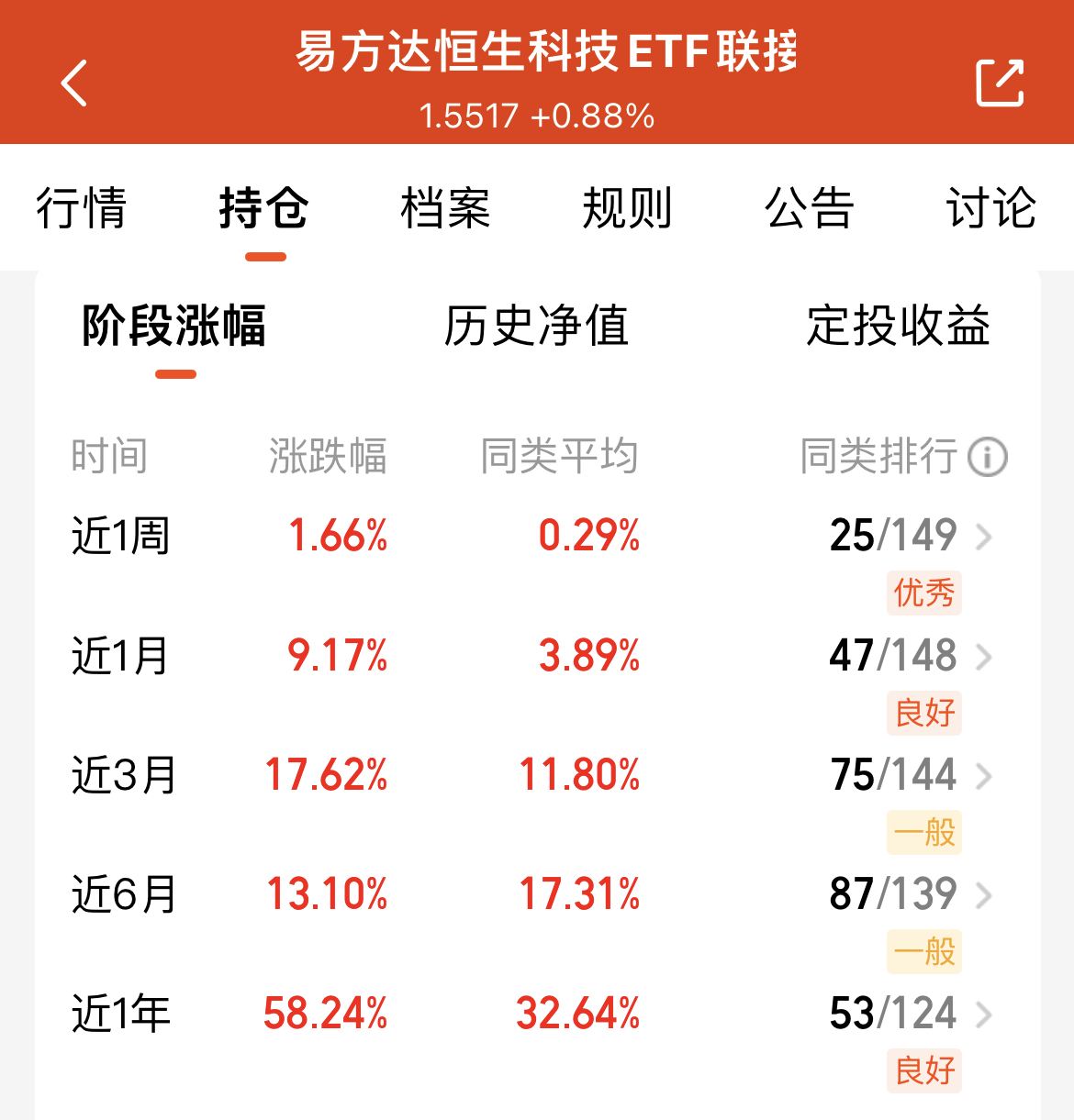 今天恒生科技指数震荡回调,不过它相比A股科技股仍处估值洼地,完全不用担心太高。港股国庆不休市,过去十年国庆期间上涨概率高,我手里的$易方达恒生科技ETF联接(QDII)C(OTCFUND|013309)$紧密跟踪指数,近三月涨17.62%,趁着调整我也继续补点仓位,提前蹲国庆行情啦!