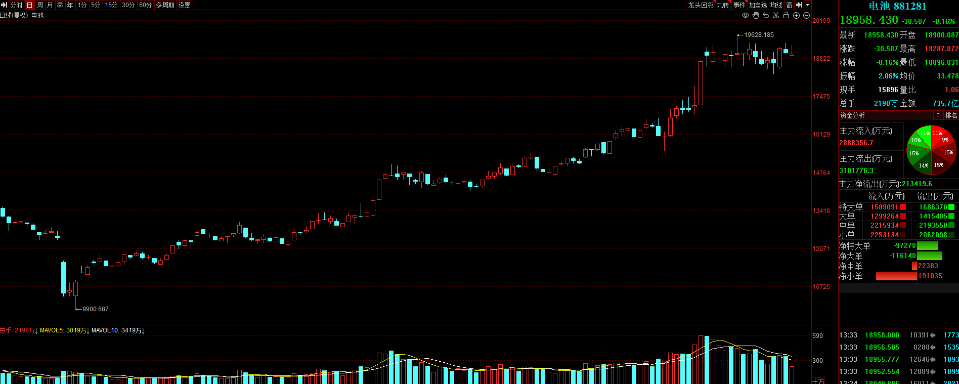 电池板块高位震荡,指数微微翻绿,但附图MACD金叉趋势很好,所以我会继续格局。