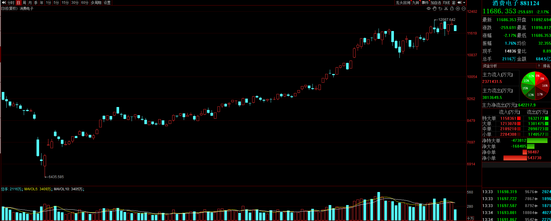 消费电子高位震荡,指数微微翻绿,但附图MACD金叉趋势很好,所以我会继续格局。