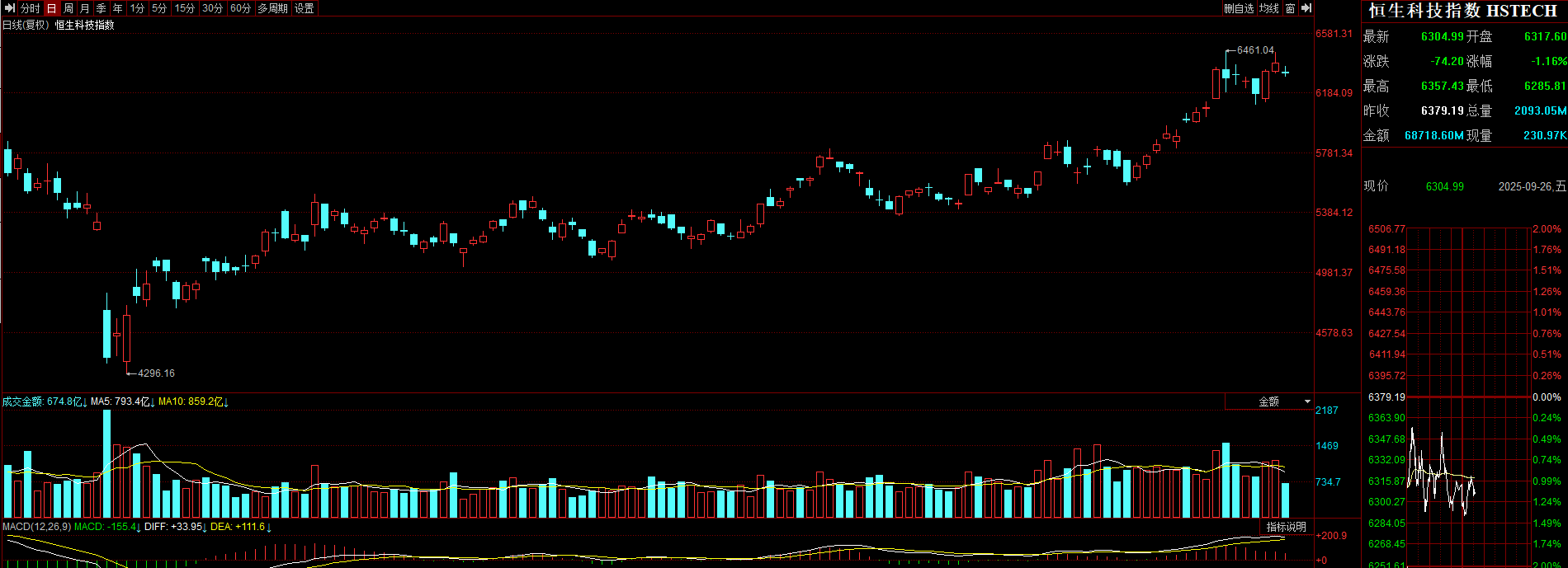 恒生科技指数高位震荡,短期行情被5日均线支撑,附图MACD金叉向上,多头趋势不变,当下可以继续格局。