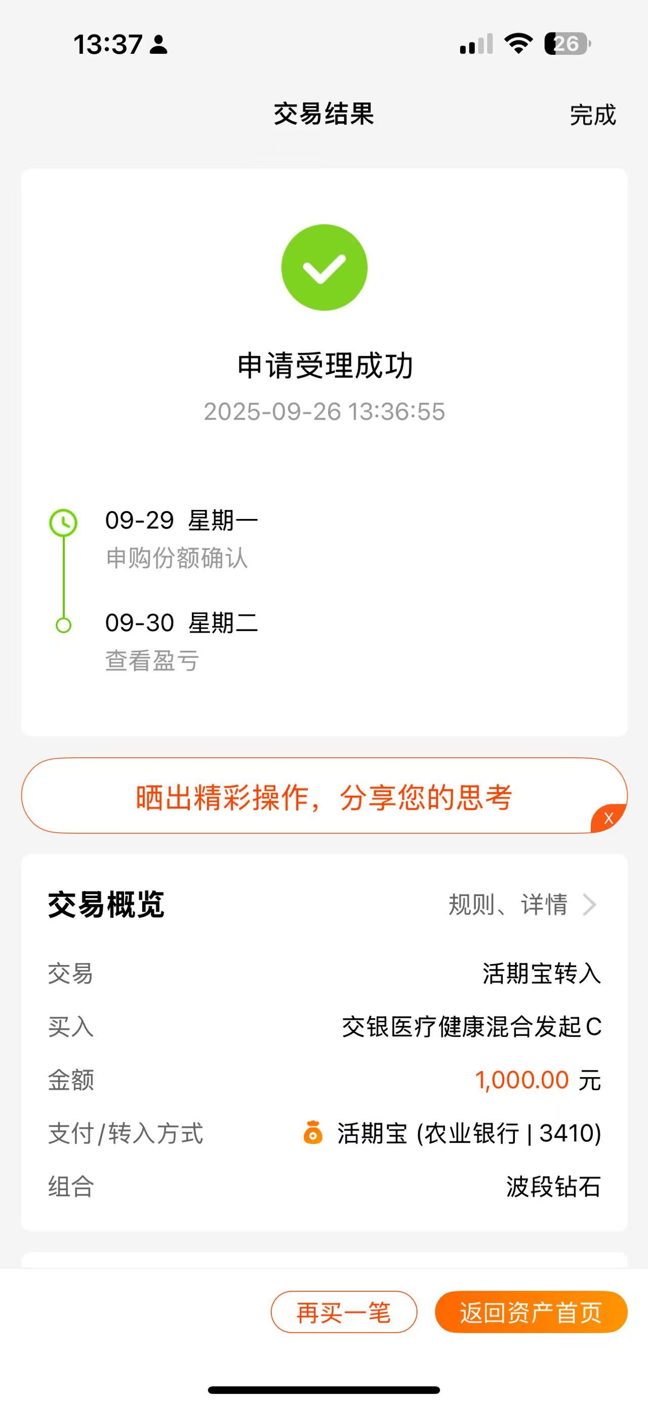 操作:买入1000元$交银医疗健康混合发起C(OTCFUND|019346)$基金,这只基金高度聚焦创新药,包含A股+港股双市场,持仓中港股占比非常大,这是因为很多国内最顶尖的生物科技公司都在香港上市,投资它,相当于同时抓住了A股医药龙头和港股生物科技的双重机会,该基金最近6个月收益率高达55.19%,最近1年收益率高达73.72%。