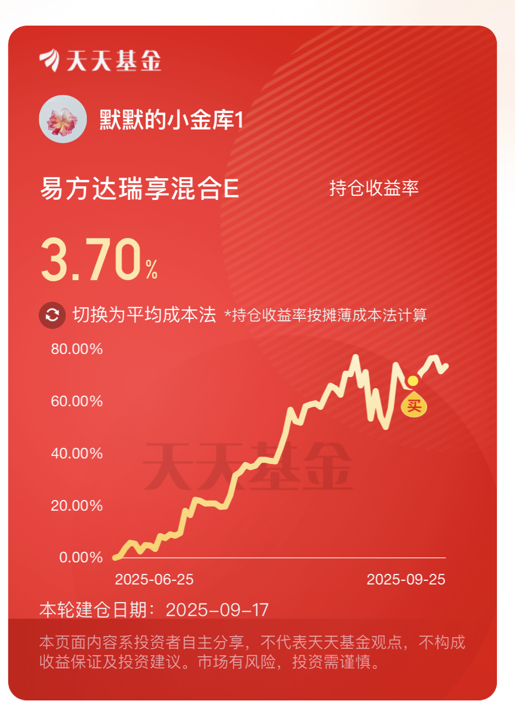 今日市场行情分化,三大指数集体收跌,科技板块也有所调整,不过但涨涨跌跌很正常。我依然看好大科技赛道,$易方达瑞享混合E(OTCFUND|001438)$是多年老牌基金,自成立来涨幅超403%,持仓聚焦成长型赛道,爆发能力强。基金经理调仓灵活,能及时捕捉市场趋势,我也继续持有啦,相信长期持有能在科技主线上吃到红利。