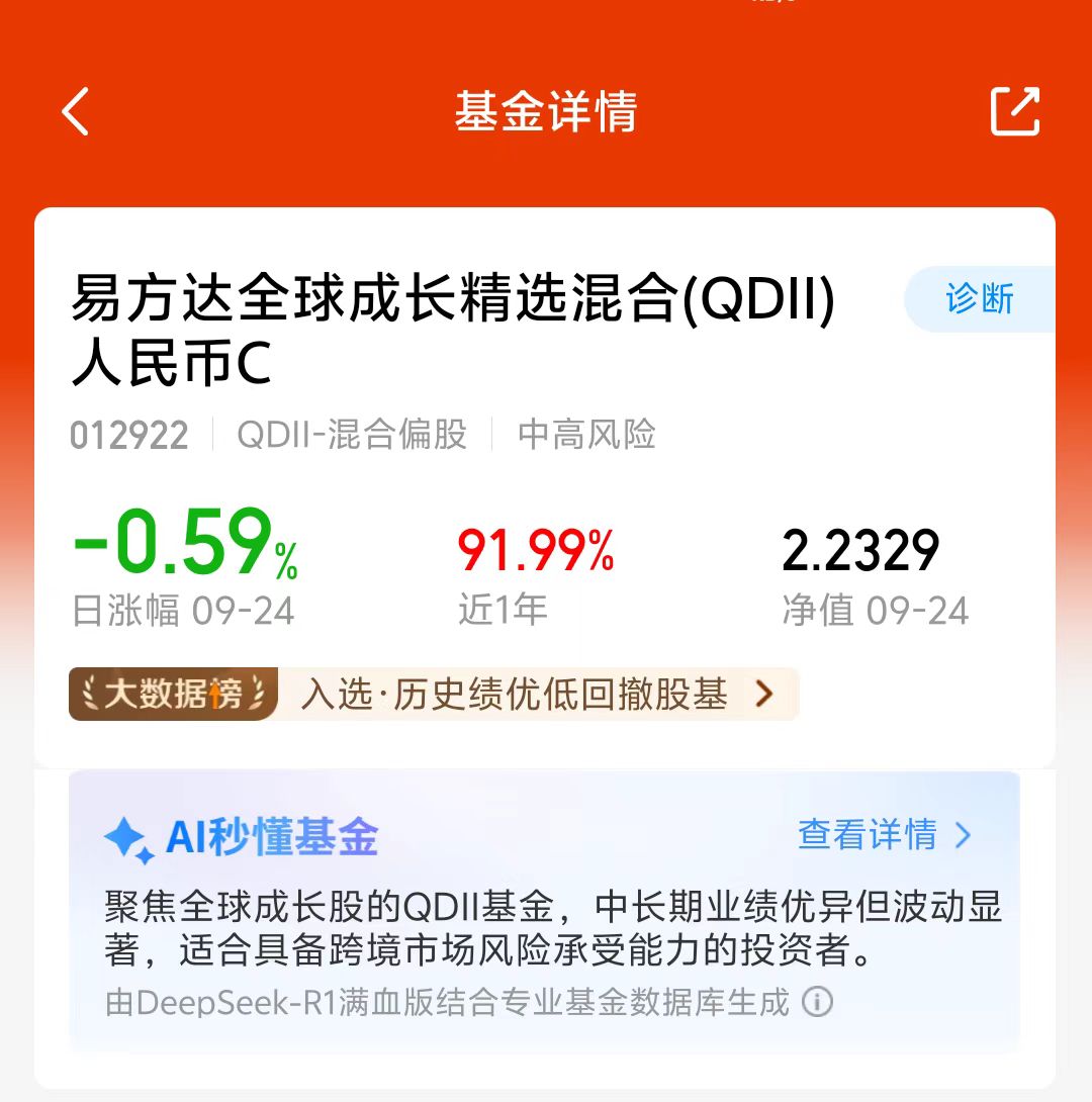美股昨夜继续调整,大A今天也回调了,大科技板块跌了不少,近期市场轮动速度很快,$易方达全球成长精选混合(QDII)人民币C(OTCFUND|012922)$持仓可投全球科技板块,美股、A股和港股都能投,经理调仓能力不错,这只还是历史绩优低回撤榜一,近一年涨了91.99%,看好这个方向,我准备分批加仓了!