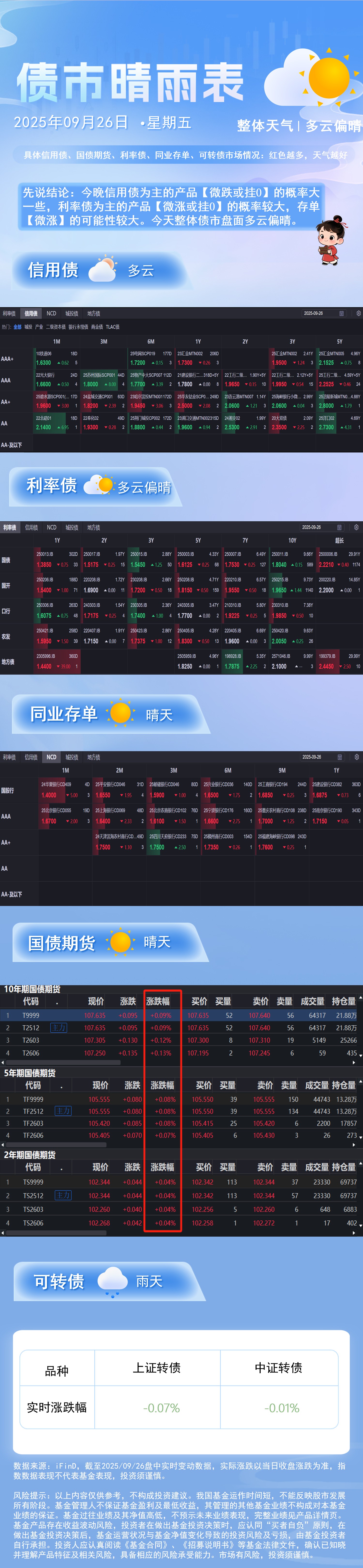 先说结论:今晚信用债为主的产品【微跌或挂0】的概率大一些,利率债为主的产品【微涨或挂0】的概率较大,存单【微涨】的可能性较大。今天整体债市盘面多云偏晴。