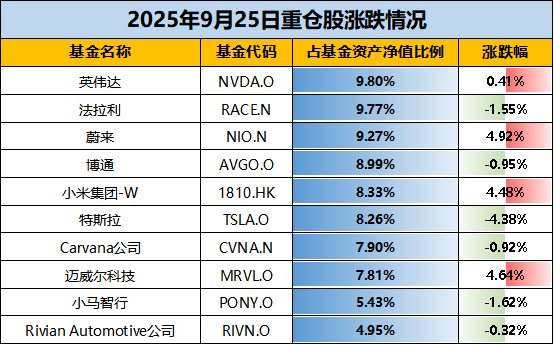 【十大持仓】根据最新披露的基金定期报告,截至2025年二季度末,华宝海外新能源汽车前十大重仓股包括英伟达、法拉利、蔚来、博通、小米集团-W、特斯拉、Carvana公司、迈威尔科技、小马智行、Rivian Automotive公司,占基金资产净值比例合计为80.51%。