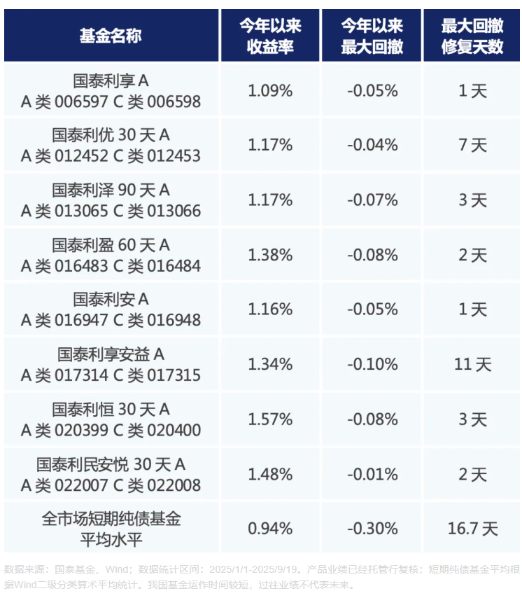 文中提及基金自2020年至2025年上半年业绩及业绩基准业绩如下:国泰利享中短债债券A(成立日期2018/12/03,业绩比较基准为80%中债总财富(1-3年)指数收益率+20%一年期定期存款利率(税后),陶然自2020/07/07管理至今,丁士恒自2020/05/15管理至今):2.50%/2.37%,4.40%/3.27%,2.60%/2.49%,3.27%/2.60%,2.57%/3.42%,0.83%/0.47%;国泰利优30天滚动持有短债债券A(成立日期2021/06/22,业绩比较基准为100%*中债综合财富(1年以下)指数收益率,陶然自2021/06/22管理至今):2.20%/1.38%,2.70%/2.34%,3.55%/2.64%,2.47%/2.44%,0.86%/0.78%;国泰利泽90天滚动持有中短债债券A(成立日期2021/08/31,业绩比较基准为80%中债总财富(1-3年)指数收益率+20%一年期定期存款利率(税后),陶然自2021/08/31管理至今):1.45%/0.97%,3.00%/2.48%,4.03%/2.60%,2.89%/3.42%,0.90%/0.47%;国泰利盈60天滚动持有中短债A(成立日期2022/11/22,业绩比较基准为80%中债总财富(1-3年)指数收益率+20%一年期定期存款利率(税后),陶然自2022/11/22管理至今):0.32%/0.27%,3.56%/2.60%,2.96%/3.42%,1.07%/0.47%;国泰利安中短债债券A(成立日期2022/12/05,业绩比较基准为80%中债总财富(1-3年)指数收益率+20%一年期定期存款利率(税后),陶然自2022/12/05管理至今):0.37%/0.25%,3.36%/2.60%,2.52%/3.42%,0.83%/0.47%;国泰利恒30天持有债券A(成立日期2024/03/04,业绩比较基准为中债综合全价(总值)指数收益率*90%+银行活期存款利率(税后)*10%,丁士恒自2024/03/04管理至今):1.90%/3.31%,1.14%/-0.11%;国泰利享安益短债债券A(成立日期2022/12/09,业绩比较基准为90%*中债-综合财富(1年以下)指数收益率+10%*一年期定期存款基准利率(税后),陈育洁自2022/12/09管理至今):0.23%/0.19%,3.73%/2.53%,2.87%/2.34%,0.97%/0.78%;国泰利民安悦30天(成立日期2024/12/20,业绩比较基准为90%*中债综合全价(总值)指数收益率+10%*银行活期存款利率(税后),陶然自2024/12/20管理至今):0.05%/0.37%,1.06%/-0.11%;国泰利添120天(成立日2025/1/7)、国泰利惠90天(成立日2025年6月16日)成立时间较短,暂不列示业绩。数据来源:产品定期报告,数据截至2025年6月30日。