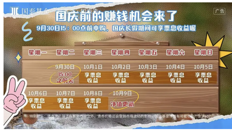 9月30日15:00点前申购,国庆长假期间可享票息收益喔~