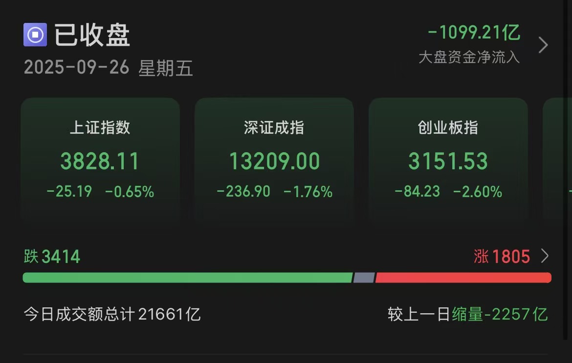 9月26日,A股三大指数齐跌,今日市场传统周期板块(石化、风电、有色金属)与科技成长板块呈现跷跷板效应。节前交投清淡,量能萎缩,市场观望情绪浓厚。港股市场集体向下,受外部因素(美元走强、关税政策)的冲击更为直接,科技和医药板块领跌,跌幅较大。