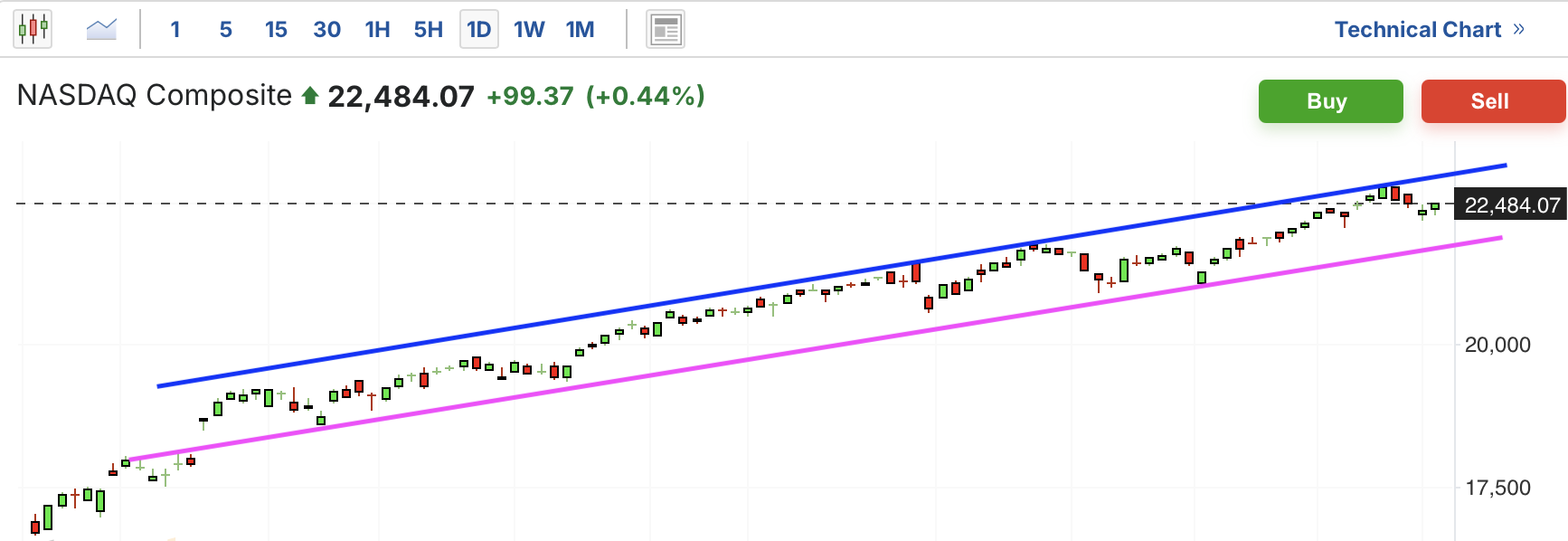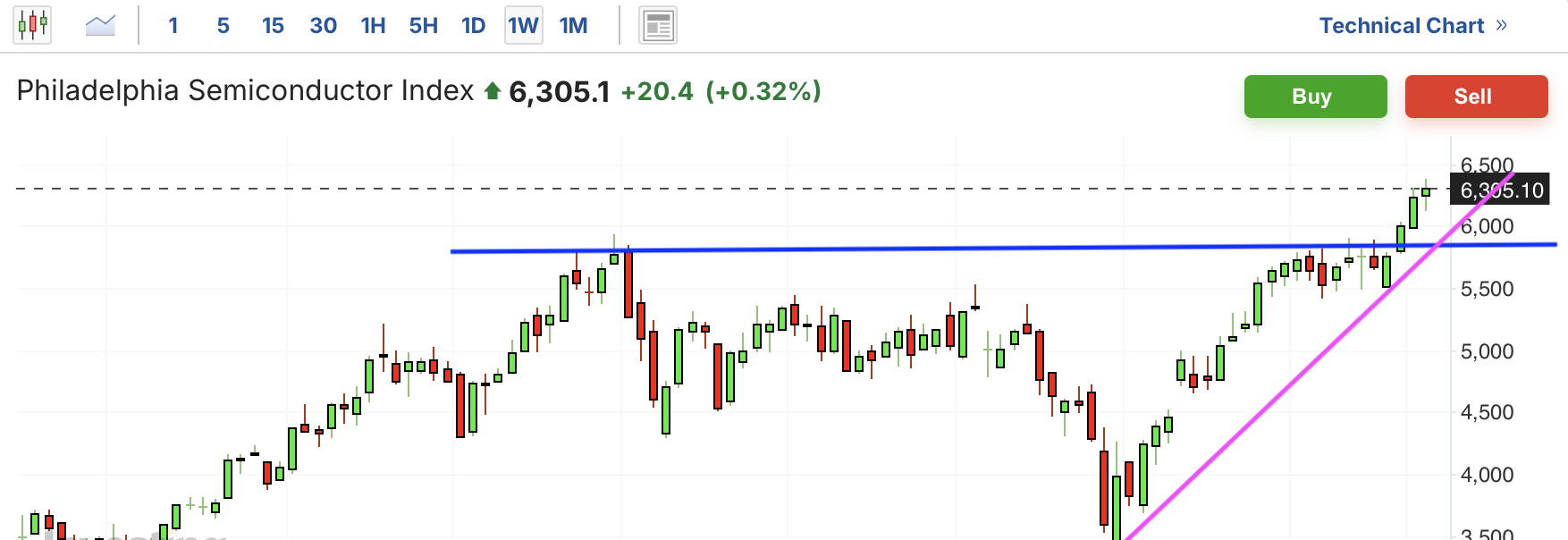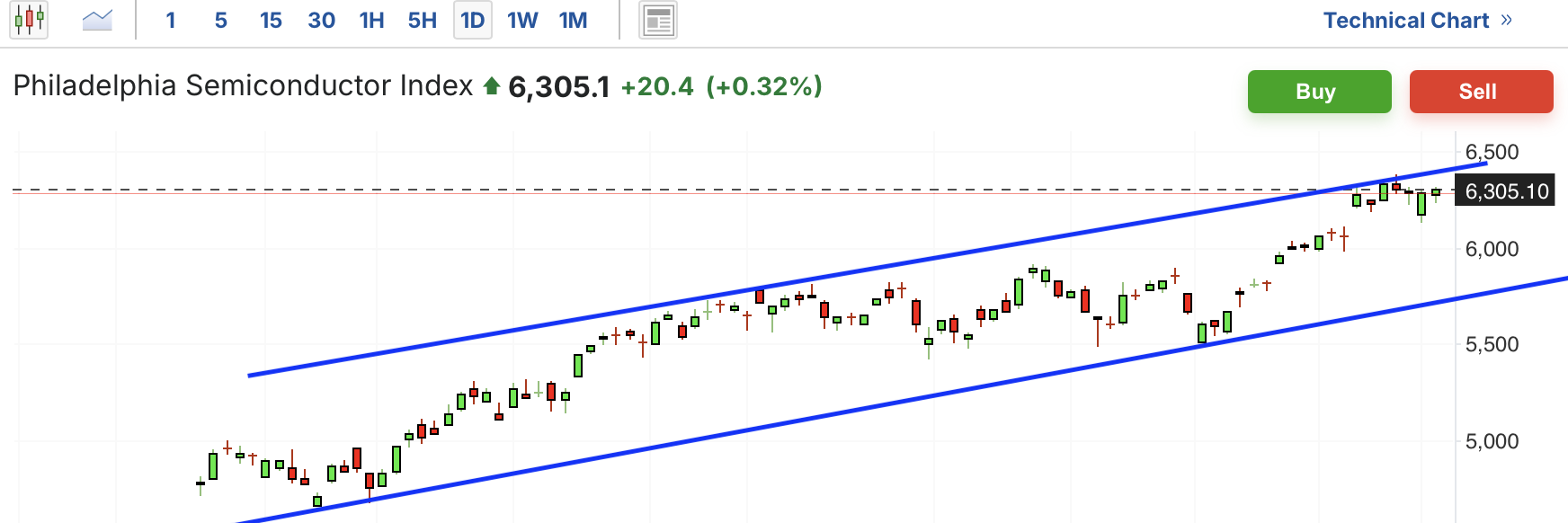 费城半导体最近突破最高点压力位,这几日虽然震荡,但没有改变上行趋势。短期进入上行通道,这几日受阻于通道压力位而回落,继续在通道中宽幅震荡。