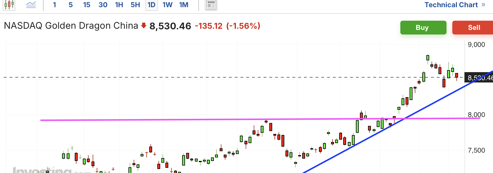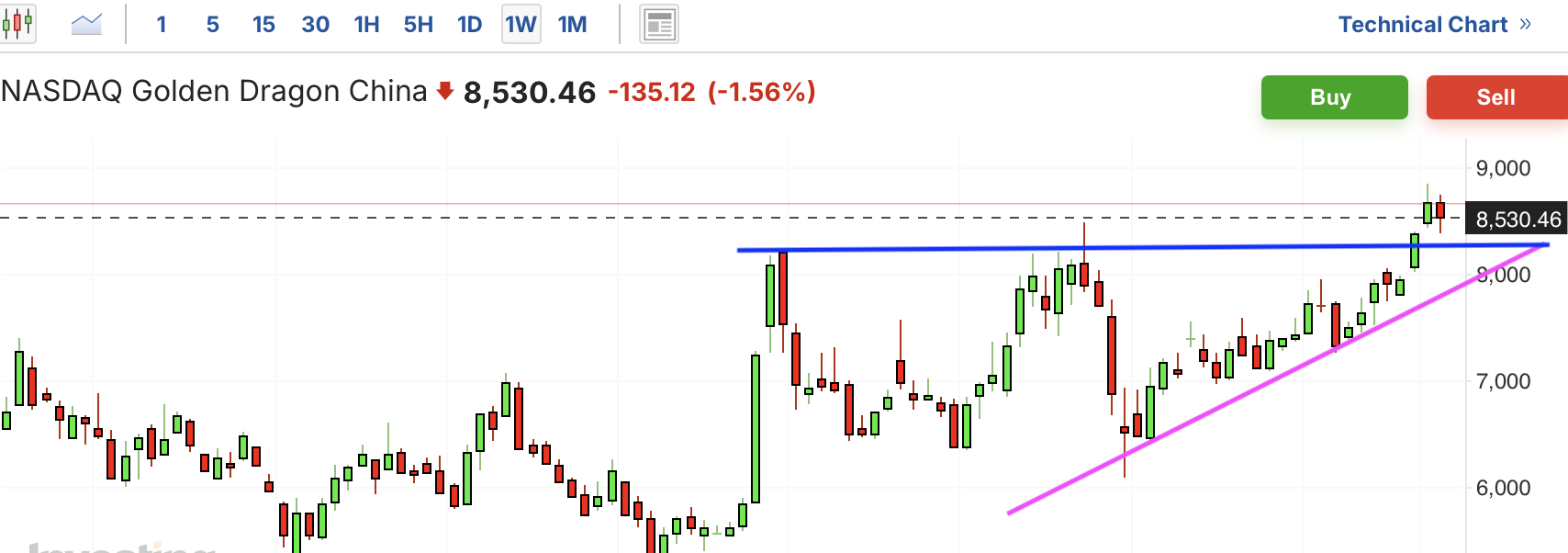 中概股此前长期盘整,近期拉升,突破关键压力位,趋势反转向上。最近在上行途中大幅回撤,这几日反弹震荡,暂时守住上涨趋势线。
