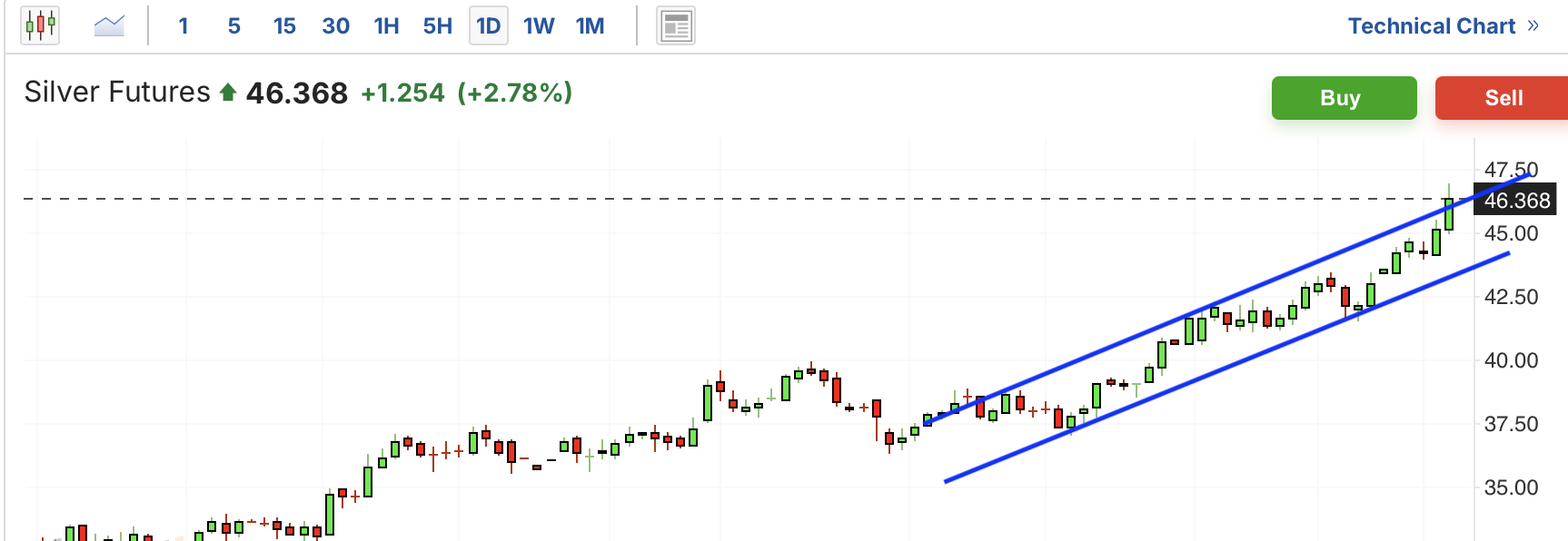 黄金和白银此前长时间盘整,最近突然拉升,突破关键压力位,进入上升通道中。最近几日走势分化,黄金在通道支撑位附近震荡,白银突破通道压力位,有些超买。