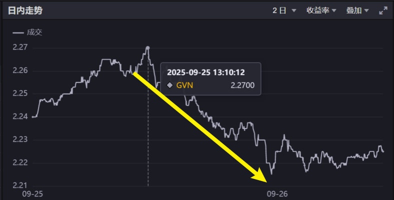 但实际上,我们看30年国债,2500006的两日线(截止周五,这只30年国债的成交笔数,已经超过2500002了,这是增值税新规后的新券),下图,从昨日最高点的2.27%开始,下行到了周五的2.22%附近,按最低点算,半个交易日内,一度下行超过5bps,这是非常大幅度的一个修复了。