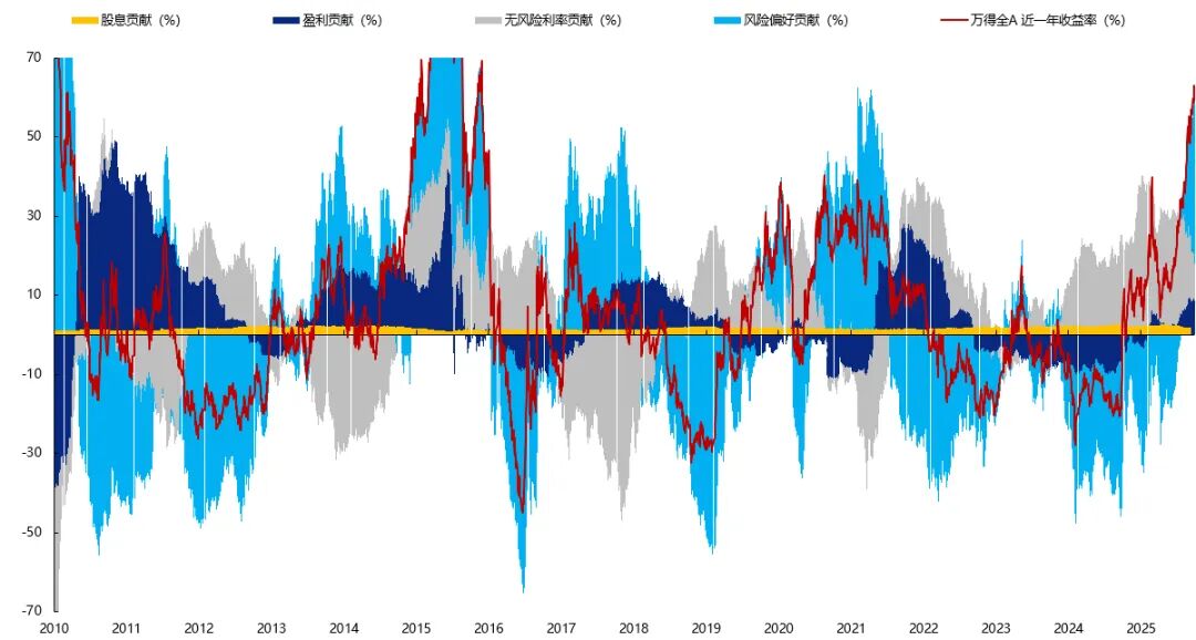 当然这个图有一定的缺陷:估值+利率+盈利全都是同比,然后用股票涨幅减去这些数值,就得出了风险偏好贡献,实际上风险偏好或者说情绪指标应该有单独的指标刻画。