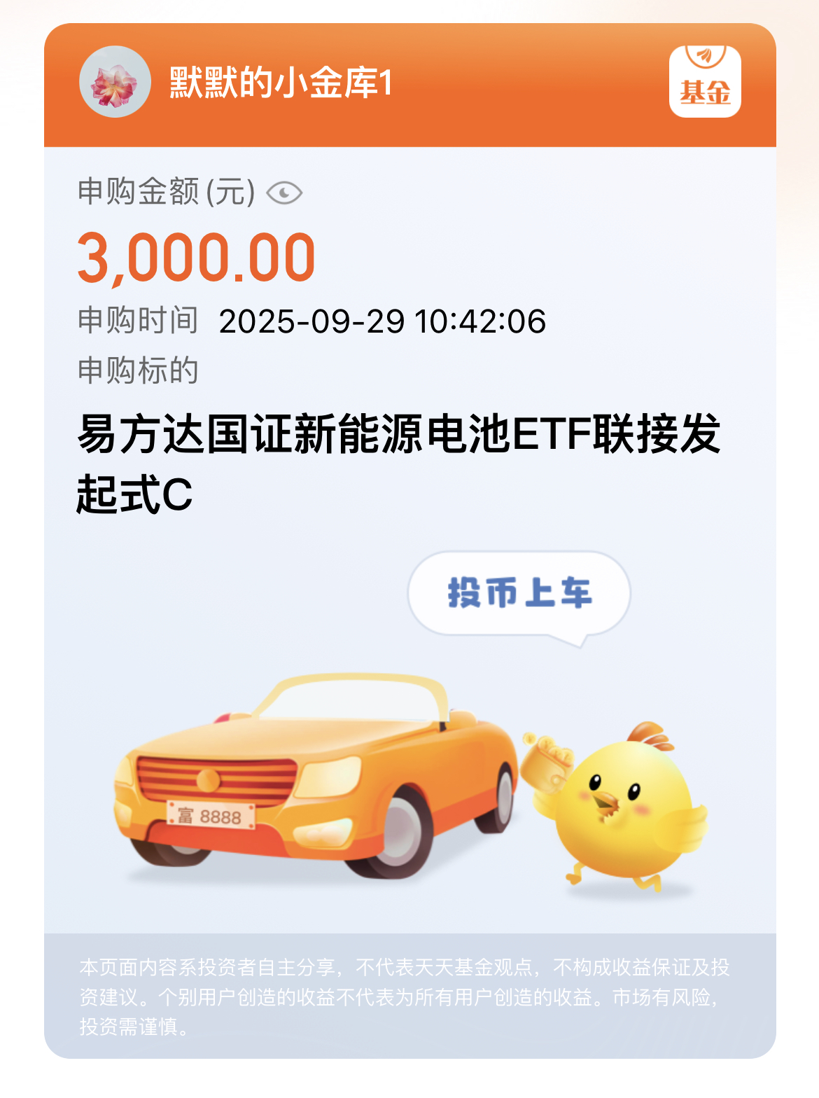 今天大盘震荡,电池板块却逆势上涨,新能源电池更是持续领涨!8、9月指数连番大涨,妥妥成了新主线!这板块跌了快3年,现在反弹幅度还不大,我也打算布局起来。今天加了3000元$易方达国证新能源电池ETF联接发起式C(OTCFUND|021034)$又聚焦储能,叠加固态电池+储能高景气双重利好,后续走势更稳。近三个月涨幅超48%,目前估值涨幅近6%,业绩表现也不错,趁着节前布局还能赶节后满7天免赎回,操作也灵活。