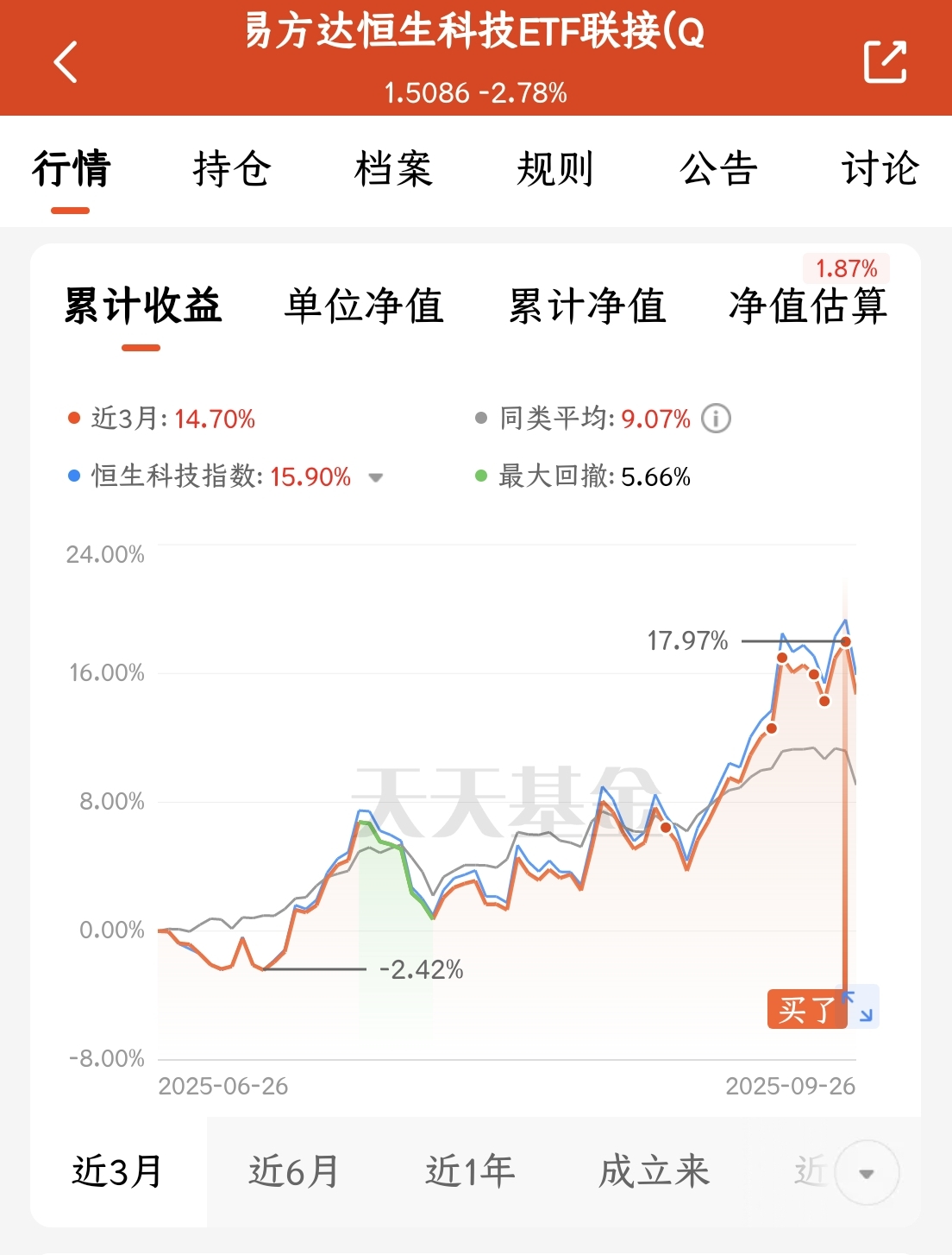 今天A股平开高走,港股则呈现更强劲的高开高走态势,市场反弹信号明显。恒生科技指数相对A股科技板块仍处于滞涨状态,估值优势突出,大家无需过度担忧高位风险。历史数据显示,过去10年国庆期间港股上涨概率较高,而今年港股双节仅休市2天,交易时间优势显著。$易方达恒生科技ETF联接(QDII)C(OTCFUND|013309)$,紧密跟踪恒生科技指数走势,成分股主要涵盖港股互联网、AI等高成长科技龙头,具备较强的市场弹性。这类标的在反弹行情中往往能率先发力,展现出更大的上涨潜力,今天继续加仓啦!
