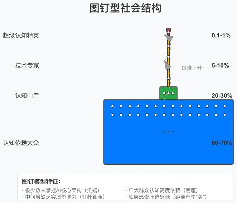 4、随着人类控制信息和能源的能力变强,金字塔型的社会结构有可能会慢慢演化成图钉型,历史周期律会随着代际分配再次展现出来,AI会加速这一进程。