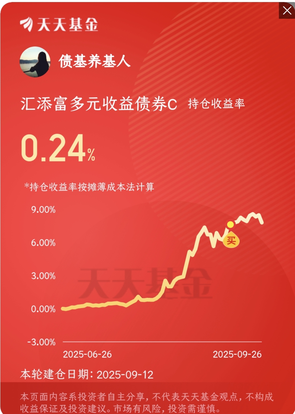 今天股市呈现平开高走态势,债市行情也同步回暖,市场整体表现不错啊。我今天打算加仓一些固收+,之前布局的$汇添富多元收益债券C(OTCFUND|470011)$(470011)还挺不错的,该基金目前持有收益率为0.24%,其核心优势在于采用科技增强策略,股票仓位可在0-20%之间灵活调整,通过仓位控制有效降低回撤风险。