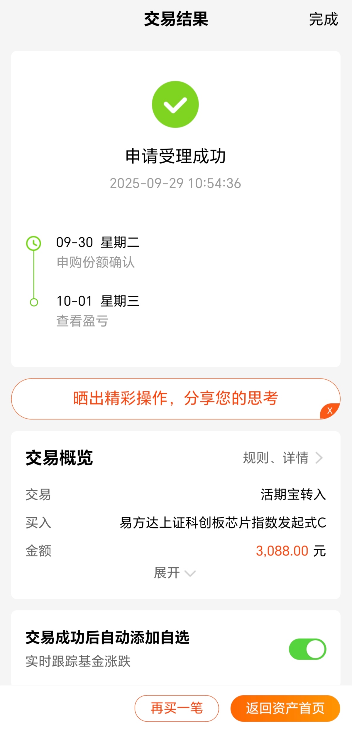 今日大盘行情继续稳定上涨,而科创板芯片虽然受到短期情绪扰动,出现短期回调,不过近期也涨幅不少,再加上英伟达注资OpenAl事件热度持续升高,我觉得后期仍然会有行情,其中我比较看好$易方达上证科创板芯片指数发起式C(OTCFUND|020671)$聚焦科创板半导体产业,近一月涨幅17.89%,近三个月涨幅57.34%,近一年涨超146.92%,无论是各个阶段的业绩,都明显领先同类,所以我选择定投加仓起来!