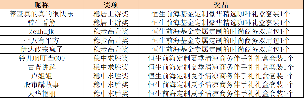 号外!!由于大家参与激情高涨,小编的领导深受感动,决定在不久的将来(快的话可能就在未来一两周,小编尽量争取!!!)继续给大家谋更多福利!别忘了搜“恒生前海基金财富号”,加“关注”,更多福利活动等你来!本次没有抽中的小伙伴千万不要气馁噢,您的运气可能在下一次活动中出现!