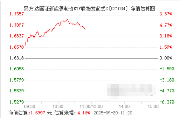 今天行情是10月行情的信号么?我看新能源电池继续领涨,$易方达国证新能源电池ETF联接发起式C(OTCFUND|021034)$目前估值收涨4.16%,感觉这里已经已经成为新的主线了呀。要知道现如今的新能源电池赛道聚焦储能,近期在固态电池+储能产业高景气的双重利好之下,我感觉后续走势会更加稳定,所以说咱节前入场后面能不能跟着吃肉呀~