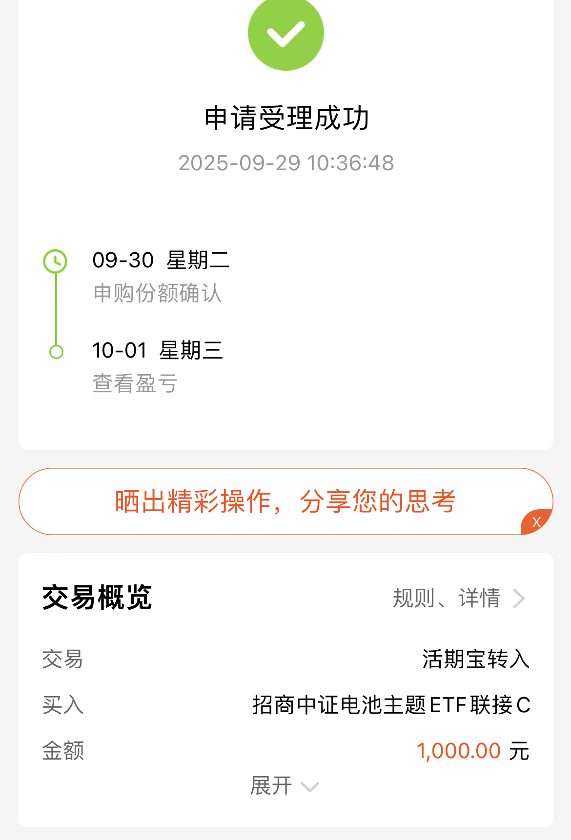 今日大盘震荡,三大指数涨跌不一,电池板块却逆势走强,锂电、固态电池等概念集体拉升,多氟多涨停,天赐材料涨超7%。趁着行情不错,我打算1000元$招商中证电池主题ETF联接C(OTCFUND|016020)$赶在双节前布局。这只基持仓真对胃口:储能占比超六成、固态电池超四成,重仓的宁德时代股价又创历史新高,市值超过茅台,未来有机会成为主线。