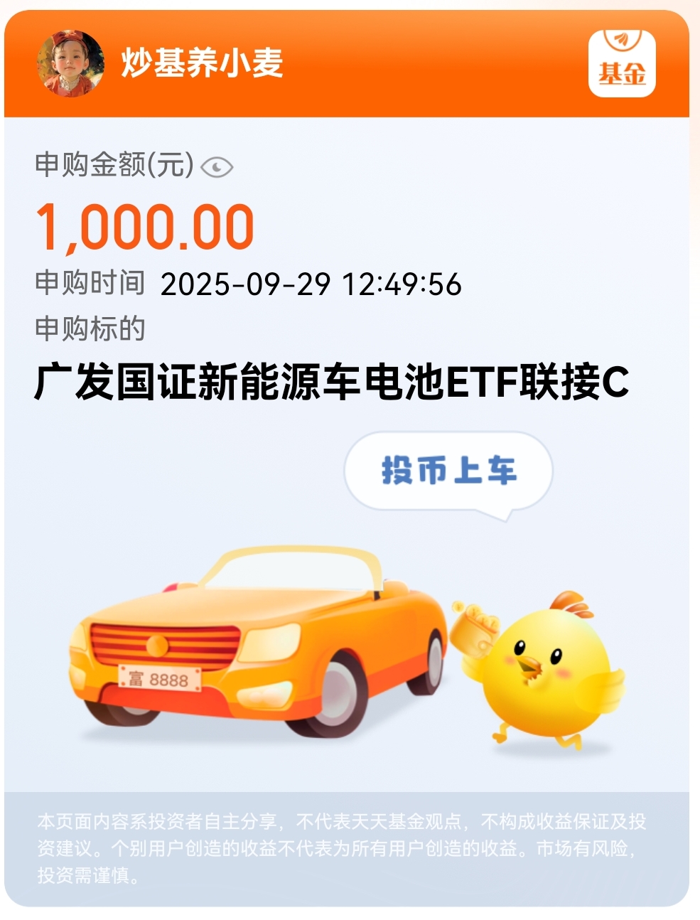 麦爸今天也没闲着,果断加仓1000块钱的$广发国证新能源车电池ETF联接C(OTCFUND|013180)$。你们瞅这基金多给力,近一年直接涨了80.41%,今天盘中也涨了3.96%,现在入手妥妥的右侧机会!