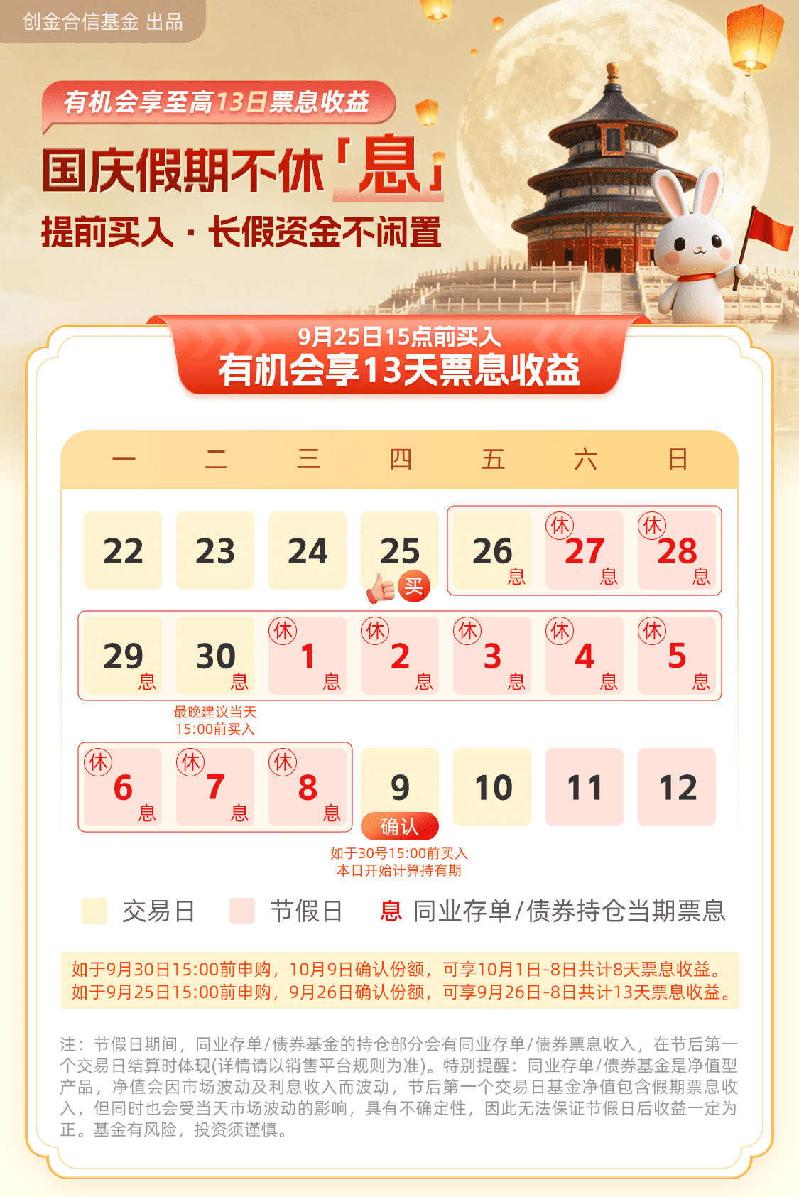 如于9月30日15:00前申购债券/同业存单基金,10月9日确认份额,可享10月1日-8日合计8天票息收益!