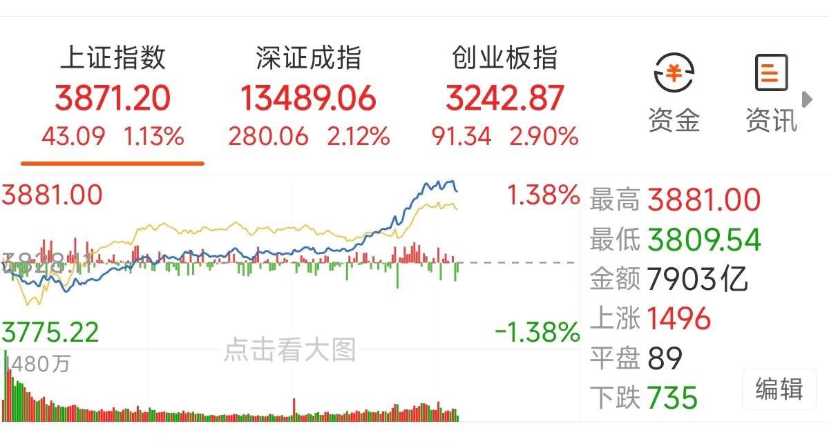 创业板指上周缩量震荡,但始终稳在均线上方趋势依旧,今日投资情绪升温,指数高开盘中震荡高走便进行反弹,截止发稿,涨超2%。指数能够迅速转为向上,说明趋势无碍,但今日拉升无量,这个量能不足继续上攻,短期可能要先震荡一下再继续上攻。