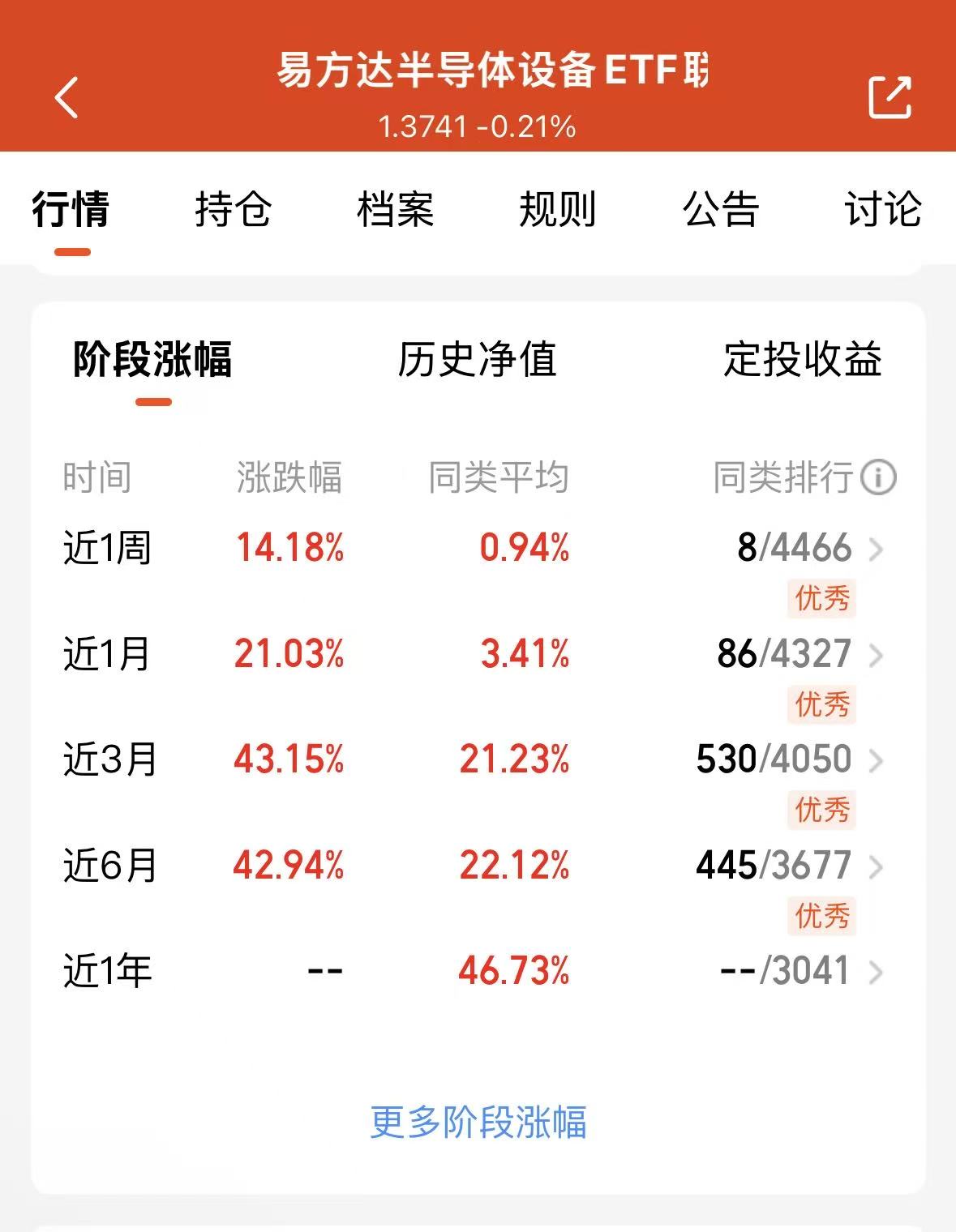 宝子们今天过节费稳了哈!$易方达半导体设备ETF联接C(OTCFUND|021894)$半导体设备尾盘又拉起来了,估值大涨2.57%。近一周14.18%,这个业绩表现是相当的给力了,嗷嗷领先,在芯片板块里已经是霸总级别的了。利好还在继续,华为昇腾910B芯片量产,2026年量产需求大,对设备企业都是利好。