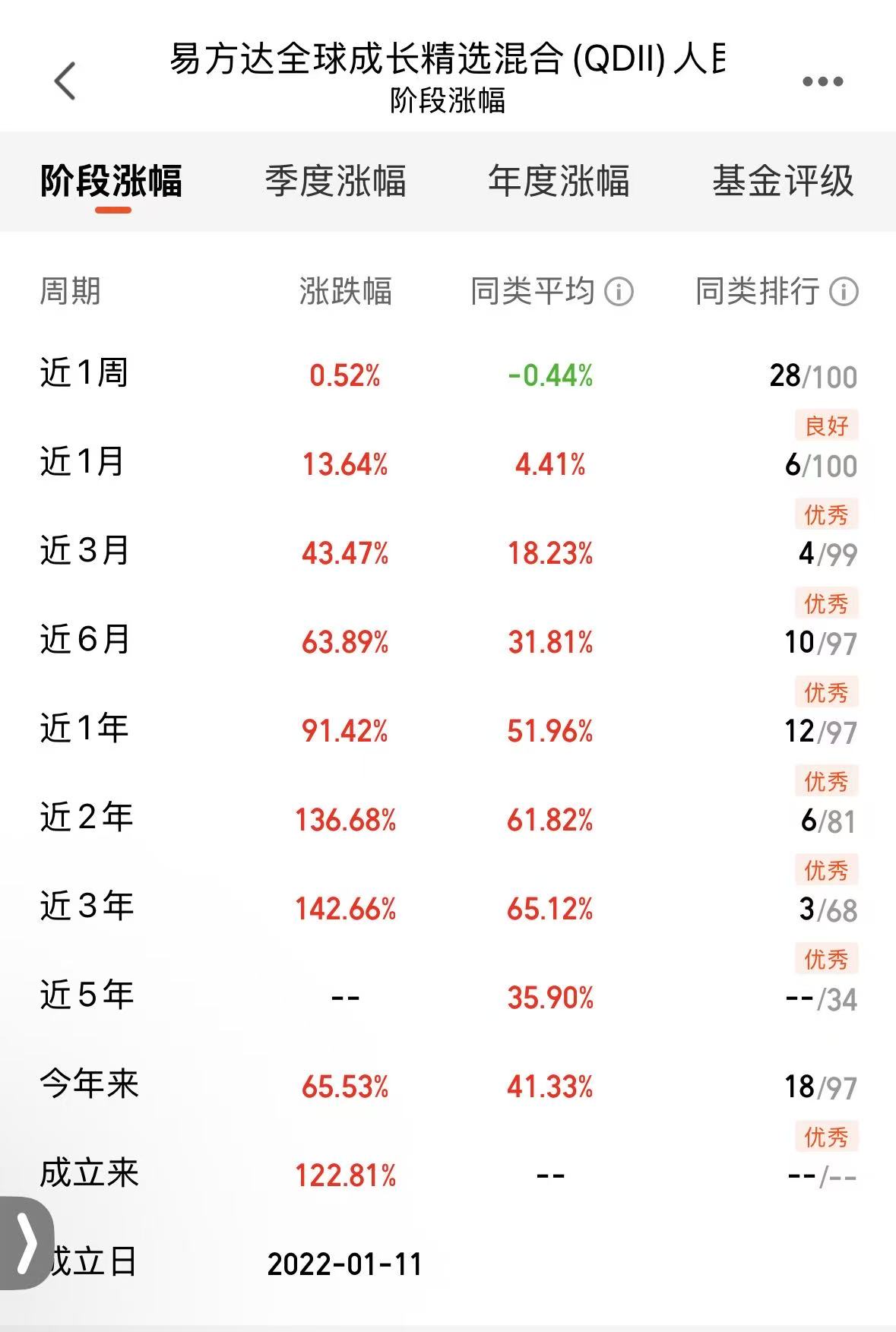看来是虚惊一场啊,上周五跌麻了,今天大口回血,但是我认为也要注意风险!$易方达全球成长精选混合(QDII)人民币C(OTCFUND|012922)$近一月13.64%,近三月43.47%,近一年91.42%,短中长业绩优秀,就是因为可以灵活配置A股港股美股,把握行情,经理调仓能力十分给力!看业绩就知道了,大幅度跑赢同类平均。