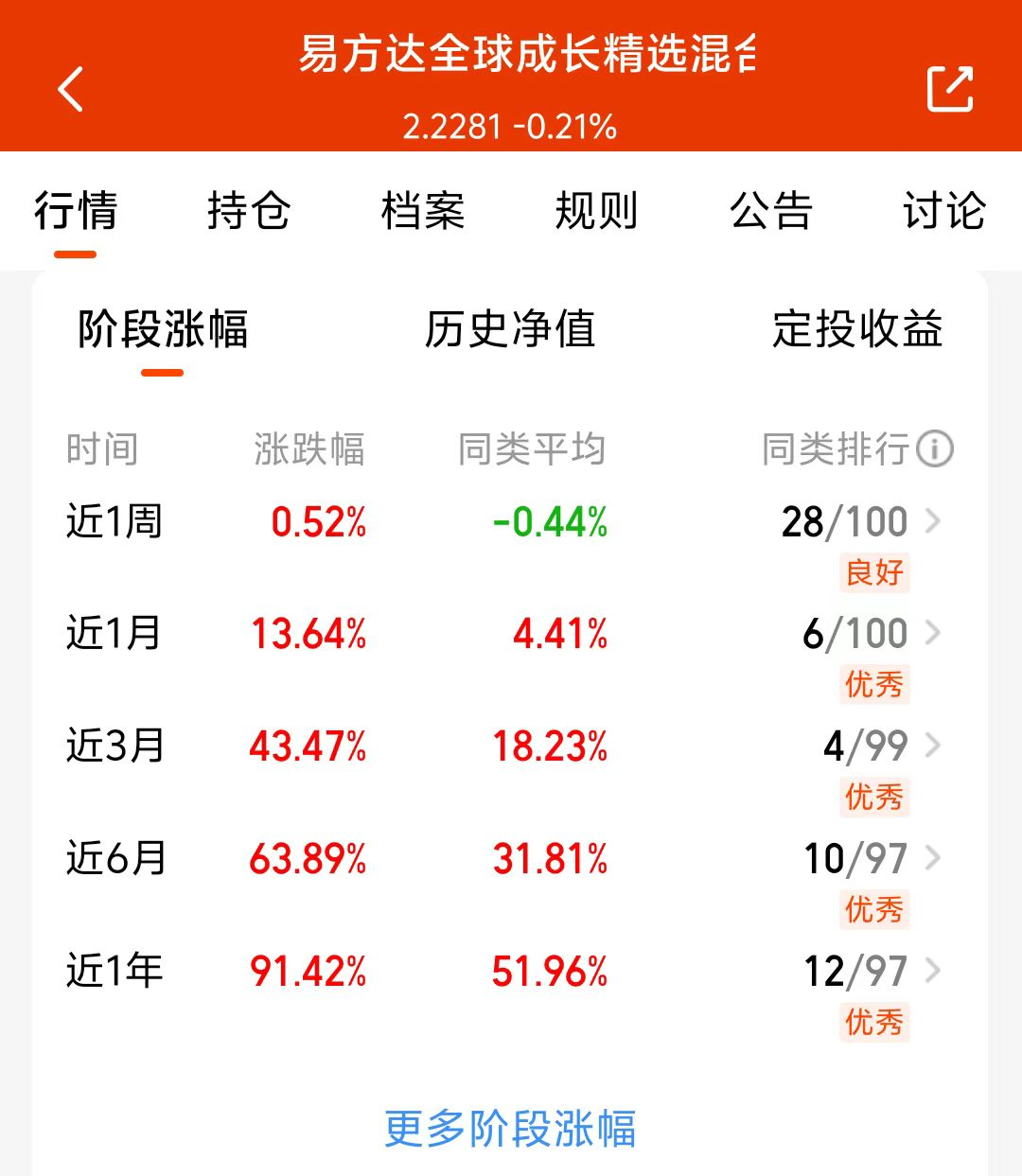 全球科技板块表现不错,美股上周五晚上涨,大A和港股今天表现也不错,美联储降息周期开启,全球科技类有望受益,单一市场风险比较大,我准备加仓$易方达全球成长精选混合(QDII)人民币C(OTCFUND|012922)$,持仓可投全球科技板块,美股A股和港股都能投,哪边上涨都不错过,近一年涨了91.42%,长期来看业绩比较稳,经理调仓能力不错,而且这只还是历史绩优低回撤榜一,我准备分批上车!