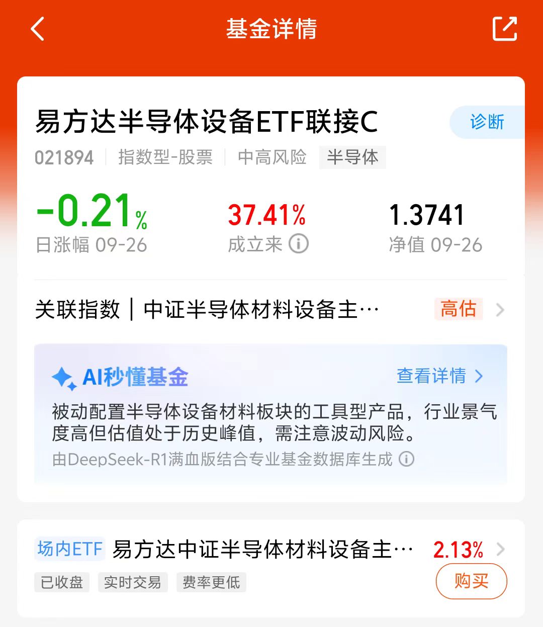 半导体设备今天表现还不错,尾盘大幅度拉升,最近还是很强势的,一周涨了15个点,做进华为又发布了后面昇腾芯片的,2026年量产需求大,设备企业有望拿到大单子!$易方达半导体设备ETF联接C(OTCFUND|021894)$近一周涨了41.18%,今天预估涨2.57%,标出不错,看好这个方向,我准备分批加仓!