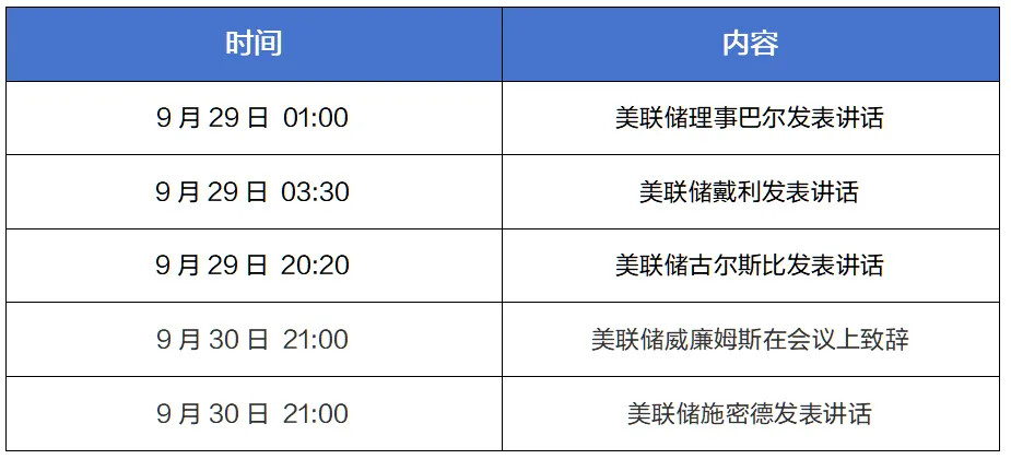 美联储多位高官将在9月底发表讲话,涉及货币政策走向、通胀控制及经济增长预期等问题,这些讲话可能对美联储后续降息路径产生一定影响,可以适当关注。