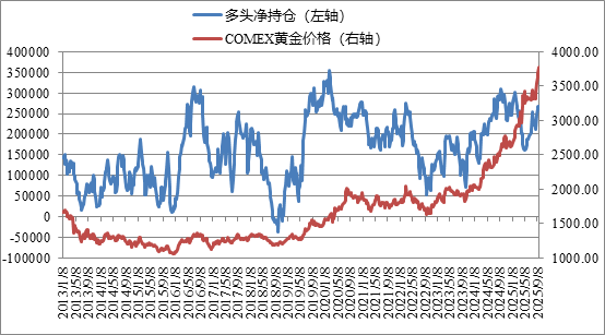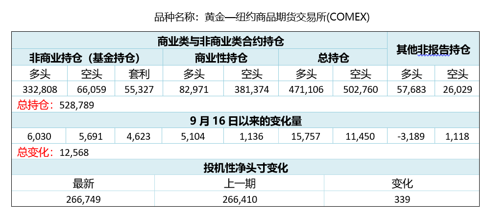 美国商品期货交易委员会(CFTC)9月23日黄金持仓数据显示:COMEX黄金投机净多头头寸由上一期(9月16日)的266,410手上升至266,749手,净多头头寸增加。