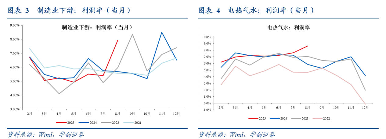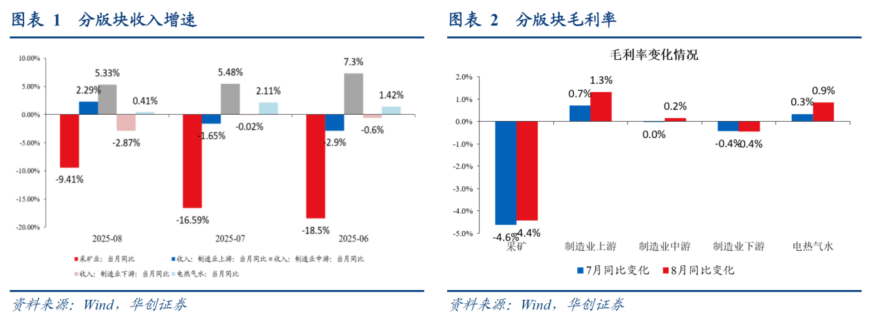 8月,PPI同比方面,制造业上游8个行业同比均值为-4.4%,前值以为-5.7%,降幅收窄。典型行业如黑色加工,8月PPI同比为-4%,前值为-10%。收入方面,8月制造业上游收入增速为2.29%,前值为-1.65%。在价格回暖,收入改善带动下,8月制造业上游毛利率为12.3%,比去年同期提高了1.3个百分点。