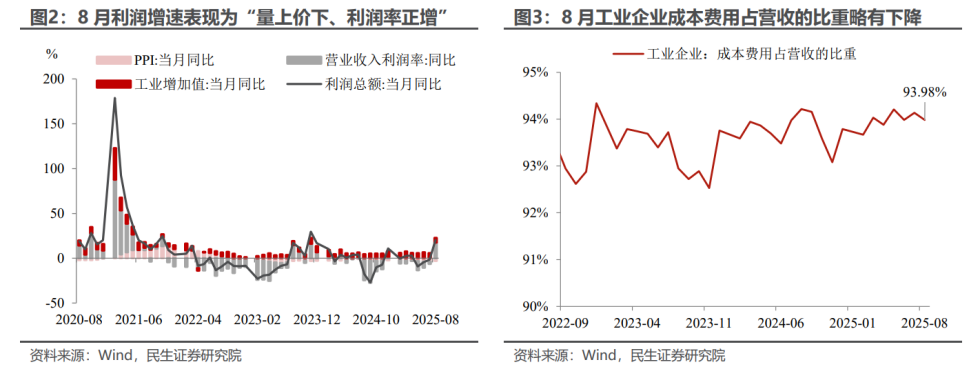 量、价、利润率拆解来看,8月表现为“量上价下、利润率正增”的形势,这与此前局势发生了明确扭转,“量”的支撑性在减弱,反之“价”的拖累在减小,更为关键的是,8月营收利润率增速发生明显改善,这也是促使8月工业企业利润高增主因。
