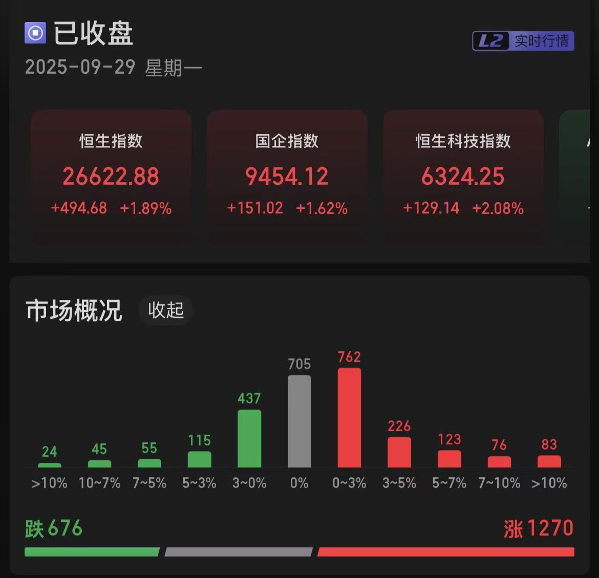 9月29日,A股三大指数全线收红,在政策利好与资金回流推动下,市场走出震荡反弹格局,新能源与券商成为领涨主线,创业板指表现最强,市场交投活跃,节前情绪偏乐观。港股市场集体向上,受A股带动及降息预期增强,恒指与恒生科技指数双双走强,科技股、新能源、机器人概念股表现突出,整体呈现普涨格局。