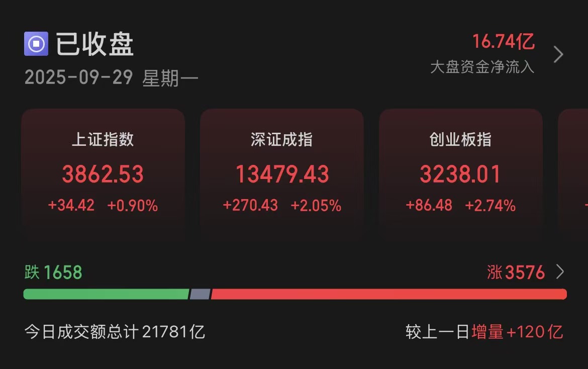指数表现,沪指上涨0.90%,深成指上涨2.05%,创业板指上涨2.74%。个股涨多跌少,全市场3576只个股上涨,下跌个股1658只。沪深京市场全天成交额2.17万亿,较上个交易日增量120亿。