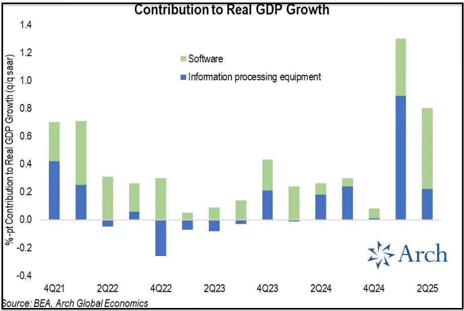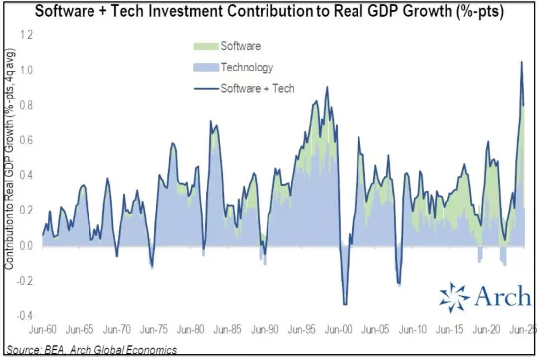 并且,这里面再仔细看一下的话,AI科技变革带来的大幅资本开支扩张对于经济的拉动贡献度,超过了1%,这和股市的表现也基本匹配。
